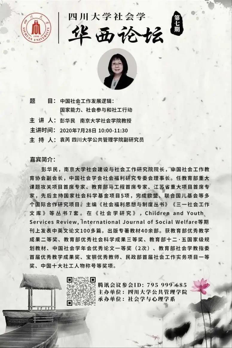 2020年7月28日上午10:00,四川大学社会学·华西论坛云系列讲座第七期于线上成功举办。中国社会工作教育协会副会长、中国社会学会社会福利专委会理事长、南京大学社会建设与社会工作研究院院长、社会学院博士生导师彭华民教授开展了题为“中国社会工作发展逻辑:国家能力、社会参与和社工行动”的精彩讲座。讲座由社会学与心理学系袁芮副研究员主持,国内高校社会工作及相关领域研究者、学生共250余人聆听了讲座。