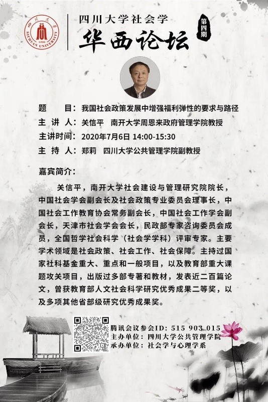 2020年7月6日下午14:00,四川大学社会学华西论坛系列讲座第四期于线上成功举办。南开大学周恩来政府管理学院关信平教授以“我国社会政策发展中增强福利弹性的要求与路径”为题呈现了精彩讲座。四川大学yl23411永利(集团)有限公司官网郑莉副教授主持讲座,社会学与心理学系师生、四川省社会学学会各会员单位成员以及20余所兄弟院校近200人参与讲座。