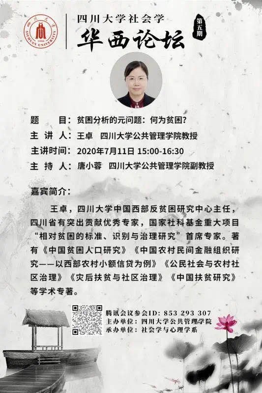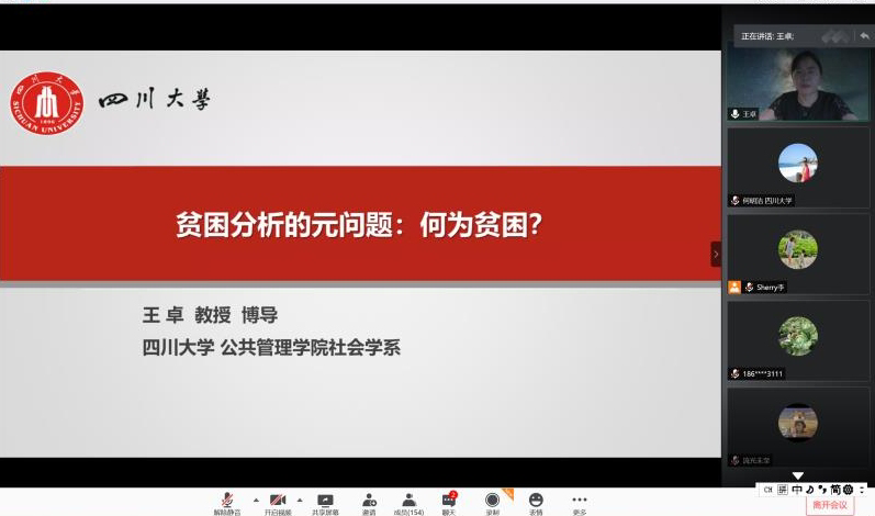 2020年7月11日下午15:00,四川大学社会学华西论坛云系列讲座第五期成功举办。四川大学yl23411永利(集团)有限公司官网王卓教授主讲“贫困分析的元问题:何为贫困?”,讲座层层深入、引人入胜。讲座由唐小蓉副教授主持,来自四川大学yl23411永利(集团)有限公司官网的师生、四川省社会学界的同仁,及兄弟院校近200人参与讲座。