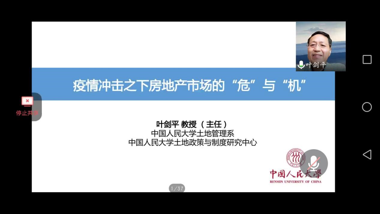 2020年6月28日上午9:30,中国人民大学土地管理系、中国人民大学土地政策与制度研究中心叶剑平教授(主任)学术讲座《疫情冲击之下房地产市场的 “危”与“机”》于线上成功举办。四川大学yl23411永利(集团)有限公司官网刘润秋教授主持了此次讲座,土地资源与房地产管理系董欢副教授、赵茜宇副研究员出席了此次讲座,土地资源管理专业研究生及本科生参加了此次讲座。