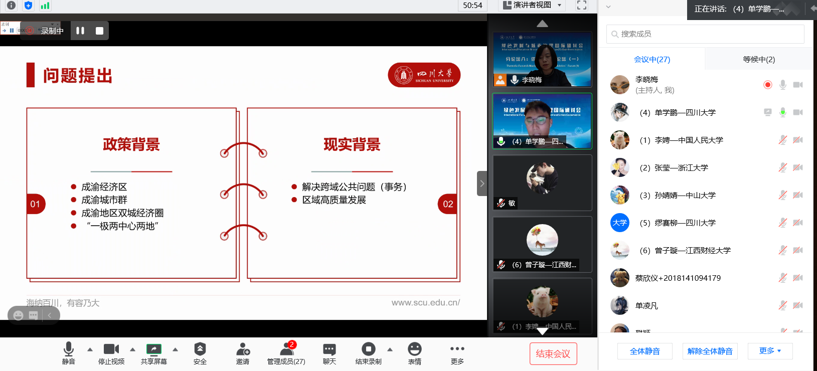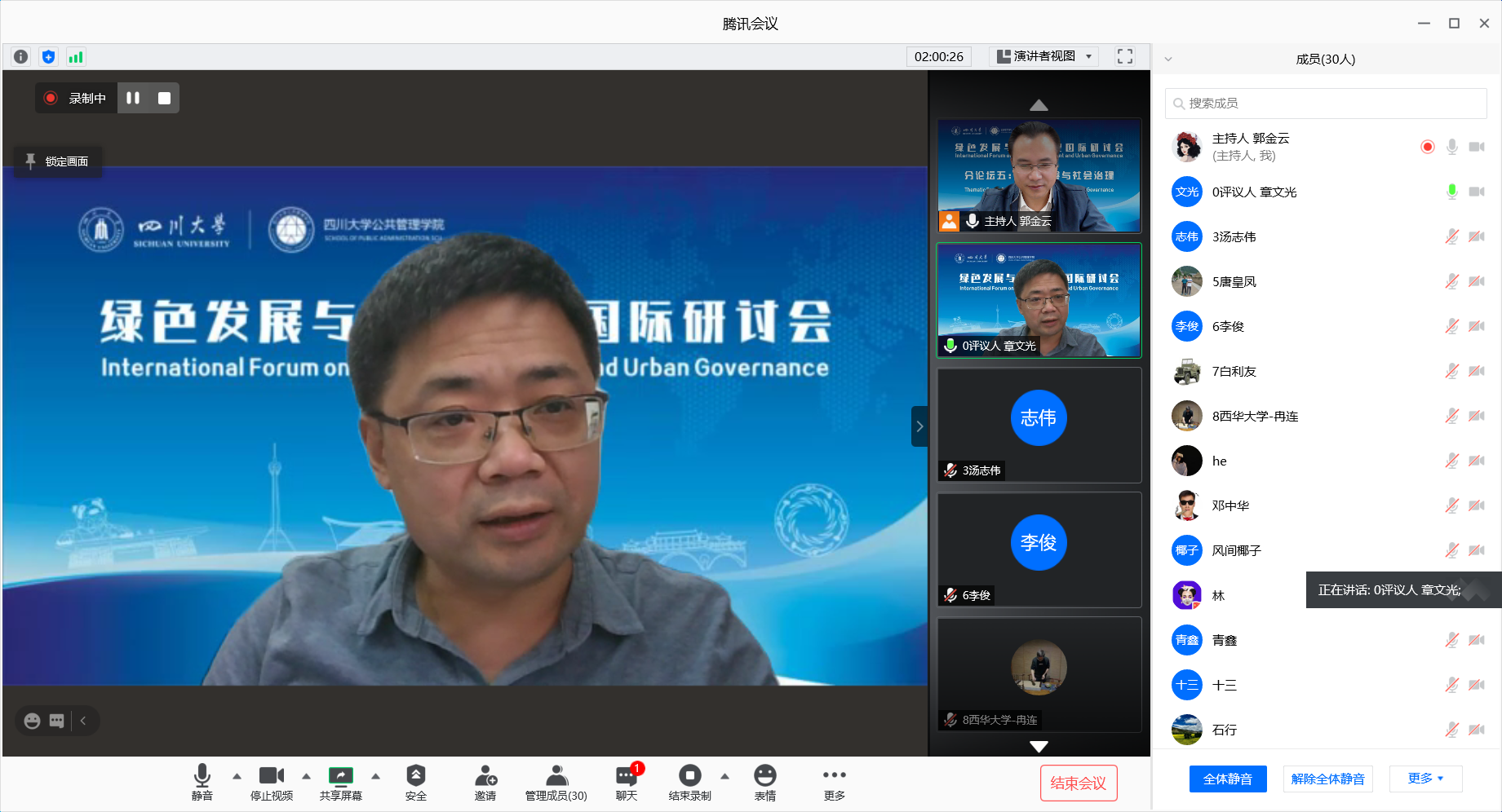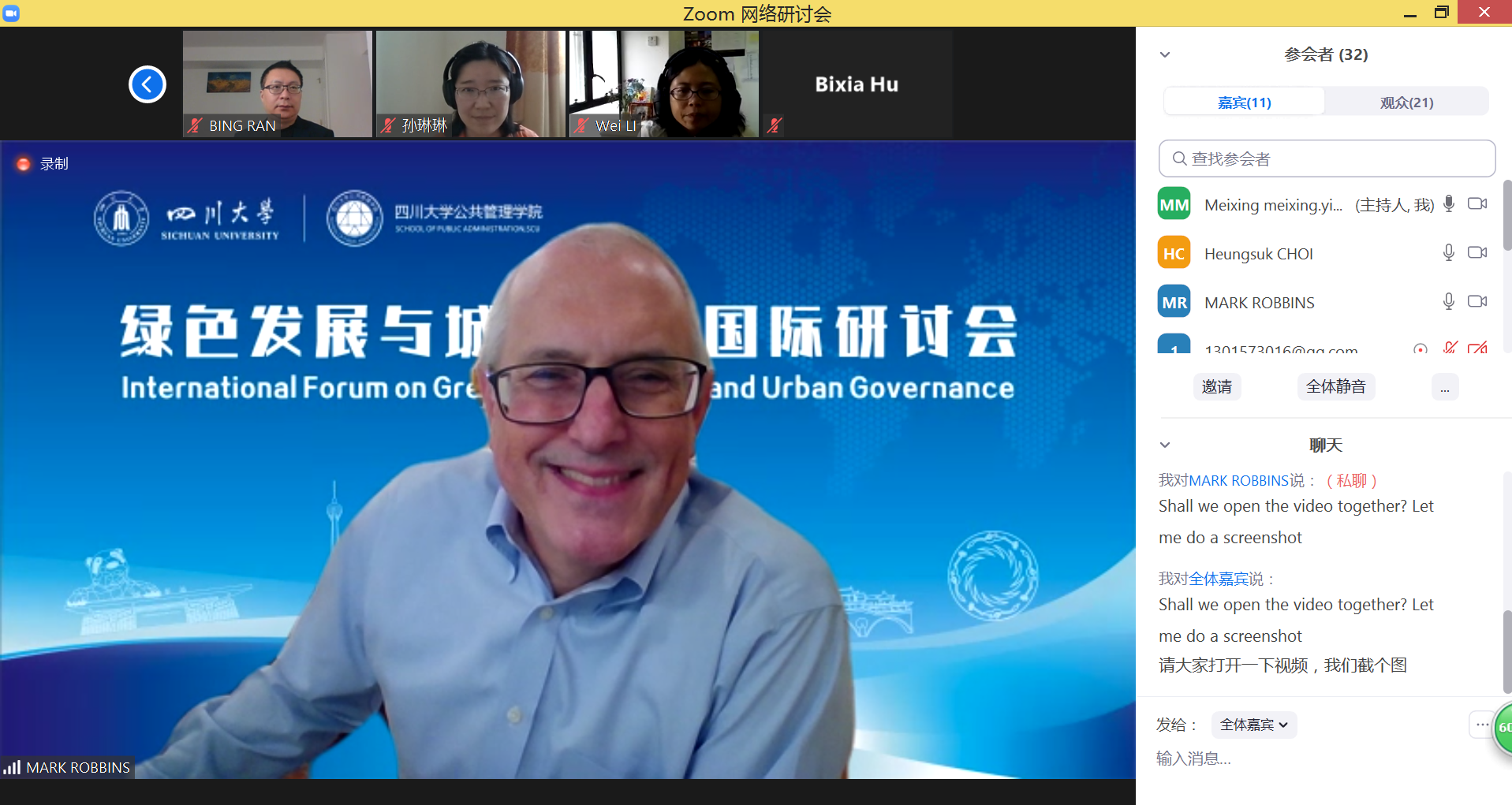 2020年9月26日下午,由四川大学主办、四川大学yl23411永利(集团)有限公司官网承办的2020年“绿色发展与城市治理”国际研讨会圆满闭幕。闭幕会议由四川大学yl23411永利(集团)有限公司官网党委副书记杨磊主持。