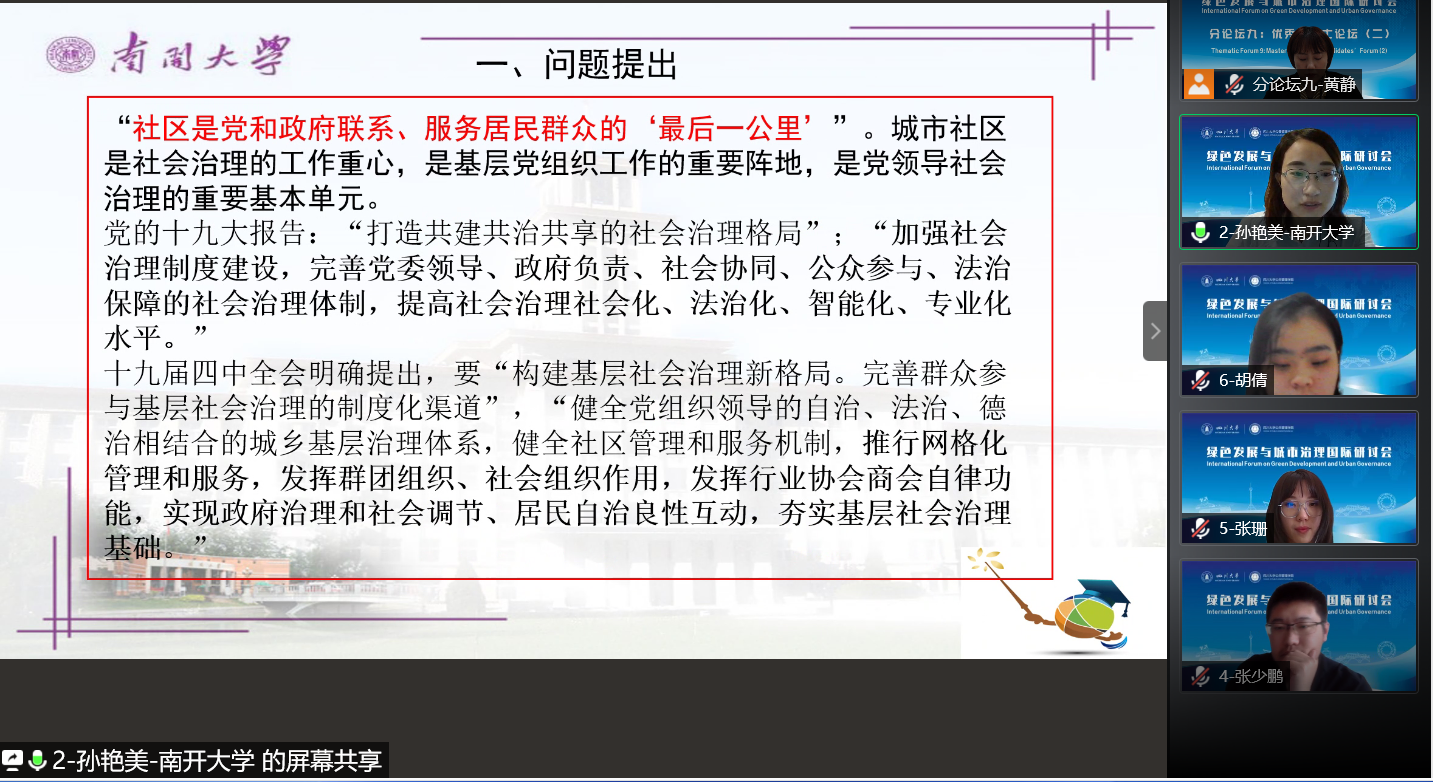 两个“优秀硕博士论坛” 吸引了来自中国人民大学、浙江大学、复旦大学、中山大学、南开大学、四川大学等14所国内知名高校学子踊跃参与,汇报翔实而丰富:从国外视野到国内研究,包含了绿色发展绩效、环境治理、应急管理、协同治理、社区养老、公共政策等方面,呈现了青年一代对绿色治理与城市治理的新思考。对此,点评人予以赞赏并且提出了详细的建议,且在理论学习与研究方法上对参会学子提出更进一步的期望。