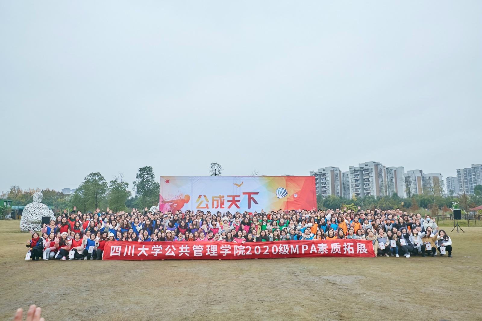 在本次素质拓展结束之际,全体同学精诚合作,用自己的身躯共同书写了“川大公管”几个宏伟大字,赫然彰显的“公成天下 管法自然”学院精神。