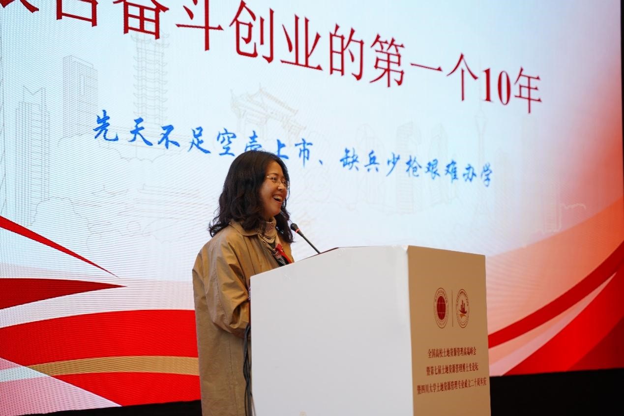 校友论坛会议开场由教师代表李敏副教授发言致辞。李敏副教授代表所有土地资源管理专业老师再一次对校友的到来表示最真诚的欢迎,并向校友们简单述说了土管这二十年的发展历程,将土管的前十年被称为“艰苦奋斗创业的第一个十年”。在这期间,四川大学土地资源管理专业 “先天不足空壳上市,缺兵少枪艰难办学”。而后十年被称为“矢志不渝铸就辉煌的第二个十年”,土地资源管理专业全体上下“师生同心其利断金、齐头并进走向辉煌”,在这十年里,我们完成本硕博学科建设,打开了四川大学土地资源管理专业的对外口碑。