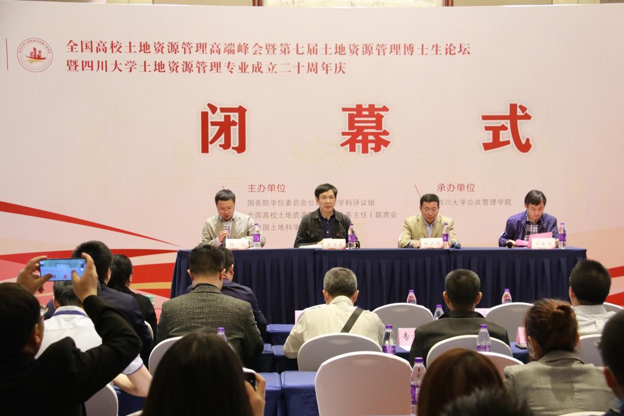 2021年4月24日下午,由国务院学位委员会公共管理学科评议组、全国高校土地资源管理院长(系主任)联席会和《中国土地科学》编辑部主办,四川大学yl23411永利(集团)有限公司官网承办的“全国高校土地资源管理高端峰会暨第七届土地资源管理博士生论坛暨四川大学土地资源管理专业成立二十周年庆”顺利闭幕。本次闭幕式由四川大学yl23411永利(集团)有限公司官网党委副书记杨磊主持,参会嘉宾包括国务院学位委员会公共管理学科评议组成员、教育部公共管理类学科教学指导委员会副主任委员、全国高校土地资源管理院长(系主任)联席会会长、南京农业大学yl23411永利(集团)有限公司官网教授欧名豪;华中农业大学yl23411永利(集团)有限公司官网教授张安录;《中国土地科学》执行主编、研究员王庆日。