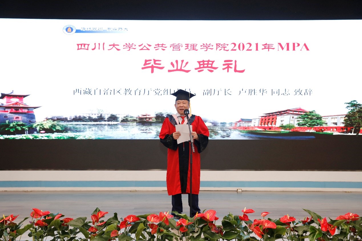 西藏自治区教育厅党组成员、副厅长卢胜华同志不仅代表西藏教育厅向各位顺利毕业的同学表示热烈的祝贺、向各位辛勤耕耘的老师表示诚挚的感谢,还向关心支持西藏教育事业发展的四川大学表示最崇高的敬意。副厅长卢胜华表示,四川大学不仅为西藏在职干部提供了提高学历层次的机会,还缓解了西藏高层次人才紧缺的现状,为西藏经济社会高质量发展和现代化建设提供了有力的人才支撑。此外,卢胜华同志还在致辞中勉励同学们要坚守初心、勤学善思、脚踏实地,要秉承学习精神,坚持学以致用,不断提升执政本领和创新能力,争取在新时代有新担当、新作为。
