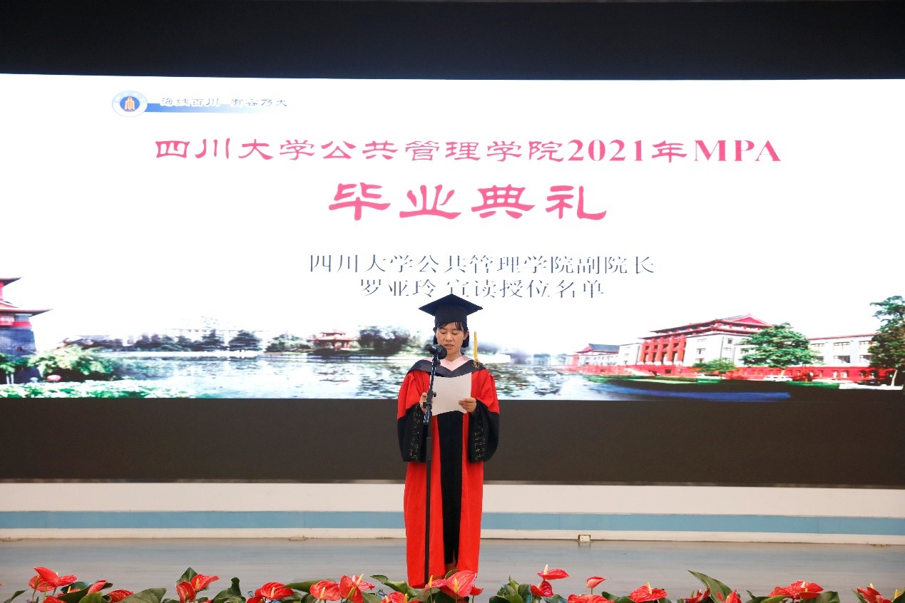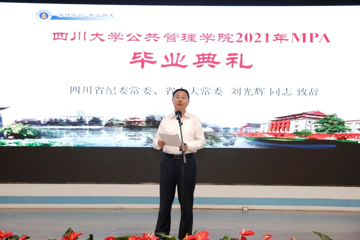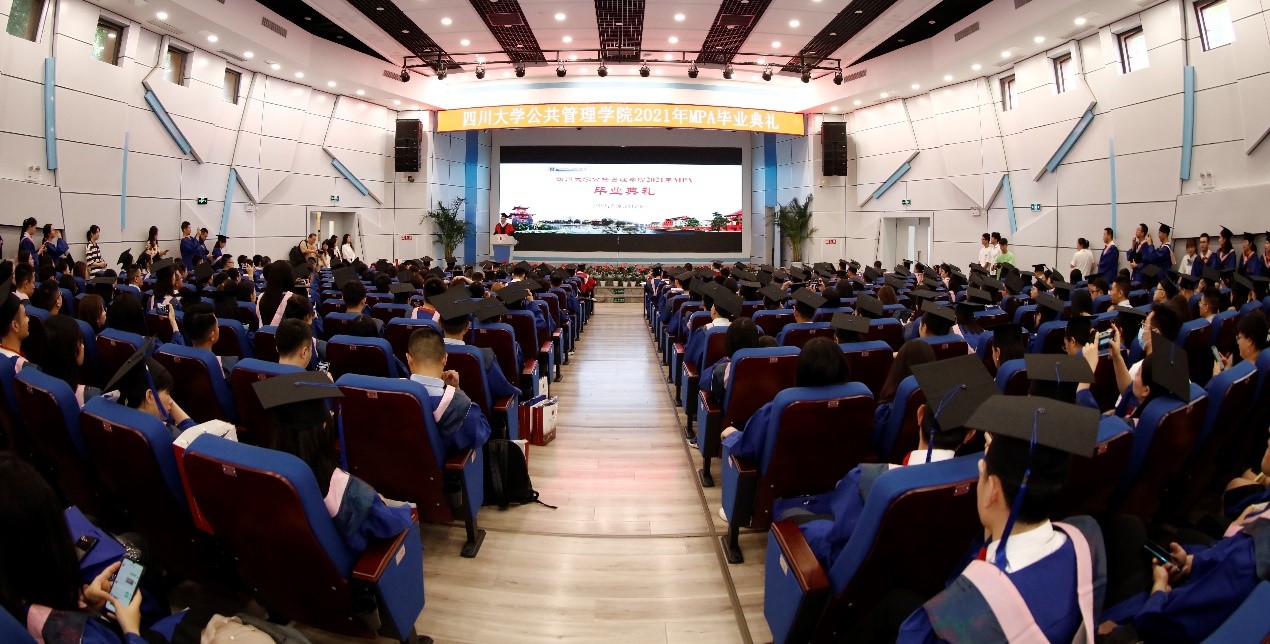 2021年7月10上午9点30分,四川大学yl23411永利(集团)有限公司官网2021年公共管理硕士(MPA)毕业典礼在四川大学东区三教演播厅隆重举行。出席典礼的领导及嘉宾有:四川大学党委副书记郭勇教授,四川省纪委常委、省人大常委刘光辉同志,西藏自治区教育厅党组成员、副厅长卢胜华同志,全国MPA教指委委员、四川大学yl23411永利(集团)有限公司官网党委书记姜晓萍教授、yl23411永利(集团)有限公司官网党委副书记杨磊老师、yl23411永利(集团)有限公司官网副院长罗亚玲副教授、yl23411永利(集团)有限公司官网MPA导师及任课教师、各班班主任以及行政老师、2020年和2021年MPA毕业生以及部分毕业生家属。典礼由yl23411永利(集团)有限公司官网副院长夏志强教授主持。