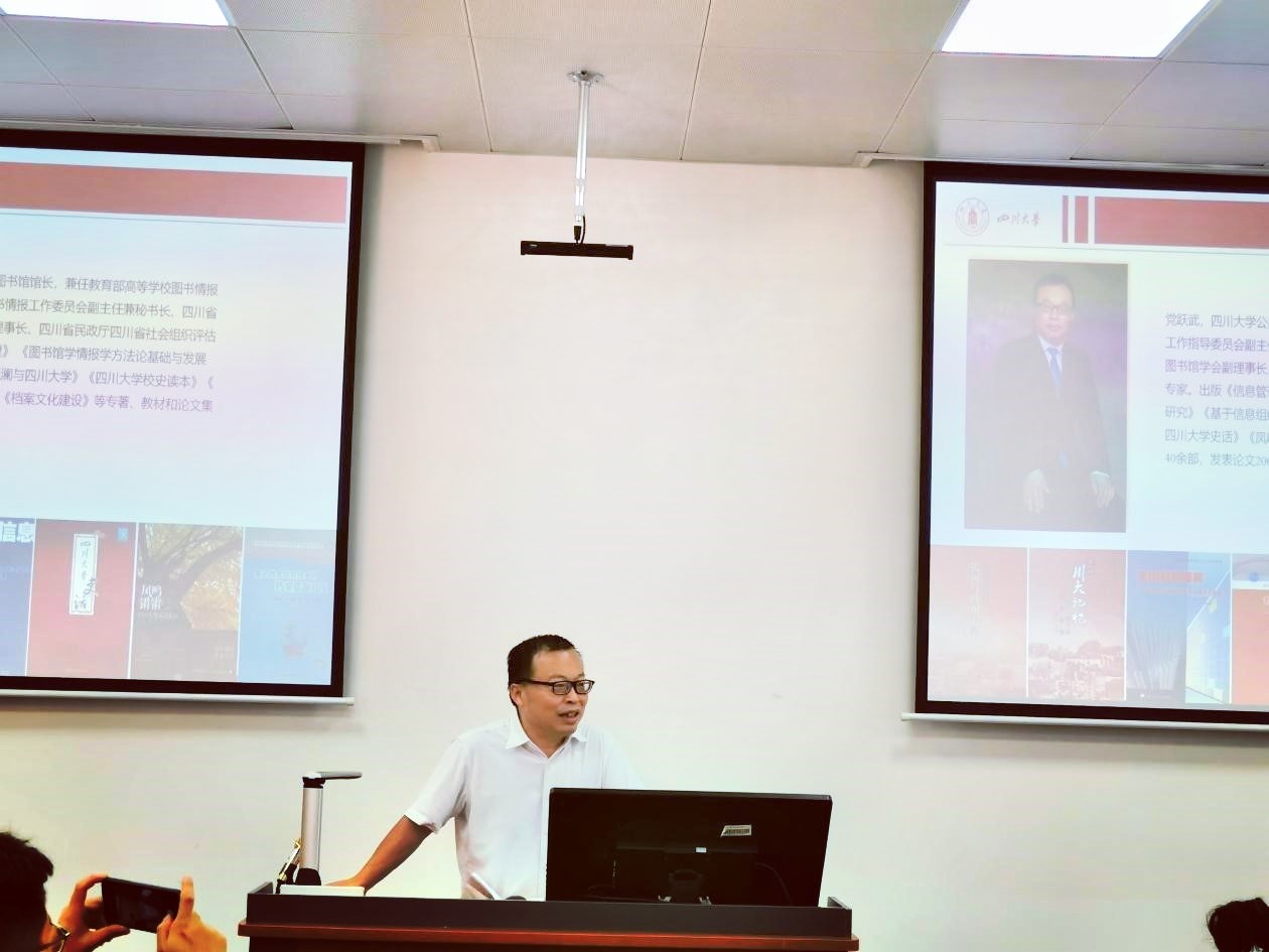 四川大学图书馆资源建设中心主任黄毕惠老师介绍了四川大学资源建设中心的主要工作内容,包括文献资源建设与红色文化资源建设等,并欢迎有意愿从事图书馆文献资源推送工作的同学到该部门实习。