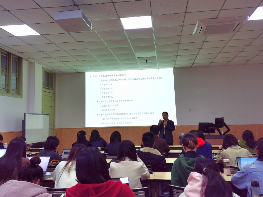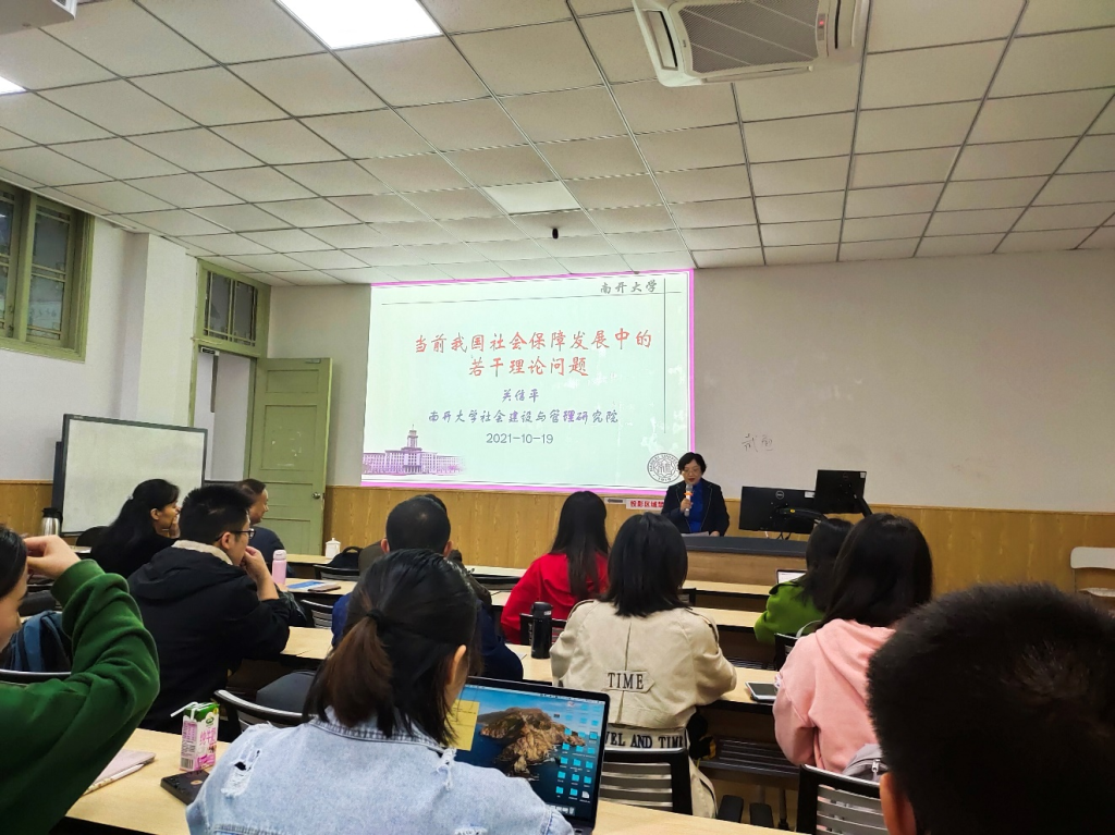 2021年10月19日下午14:00,南开大学周恩来政府管理学院关信平教授应邀到访我院,在学院114教室为社会保障专业的同学作题为《当前我国社会保障制度发展中的焦点理论问题》的讲座,本次讲座由我院党委书记姜晓萍教授主持,劳动与社会保障系蒲晓红、罗亚玲、张浩淼、李丹、林熙、张伟科、曹杨等老师和社会学系的王卓老师,以及社保专业的本硕博同学参加了讲座。