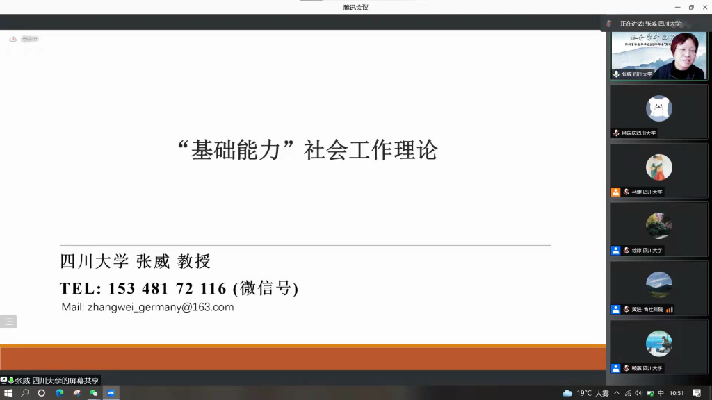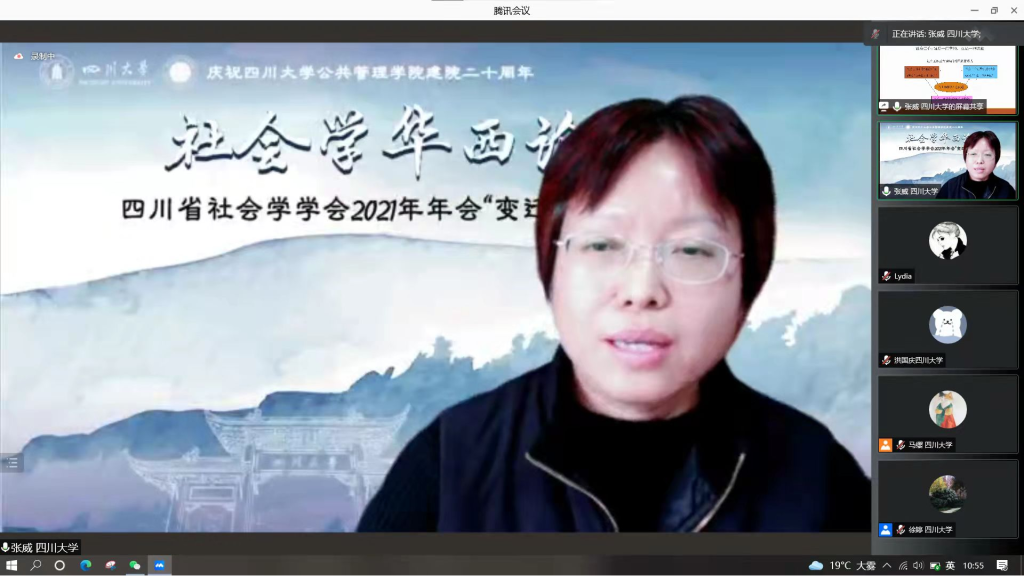 2021年11月6日,四川省社会学学会2021年年会“变迁中的西部社会”暨庆祝四川大学yl23411永利(集团)有限公司官网建院二十周年学术会议于线上举行。此次会议中,张威教授首次正式推出最新的研究成果:历经10年的社会工作基础理论研究和8年的社会工作实践研究。张威教授提出“基础能力”社会工作理论,为推动中国社会工作学科和职业的理论发展和科学化进程作出一定贡献。本次演讲也是社会学华西论坛专家代表发言之一,由四川大学yl23411永利(集团)有限公司官网社会学与心理学系马缨研究员主持,近三百名来自国内外高校的师生、学者同行聆听了讲座。