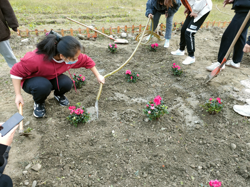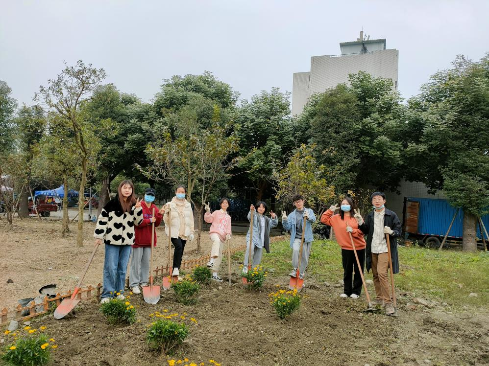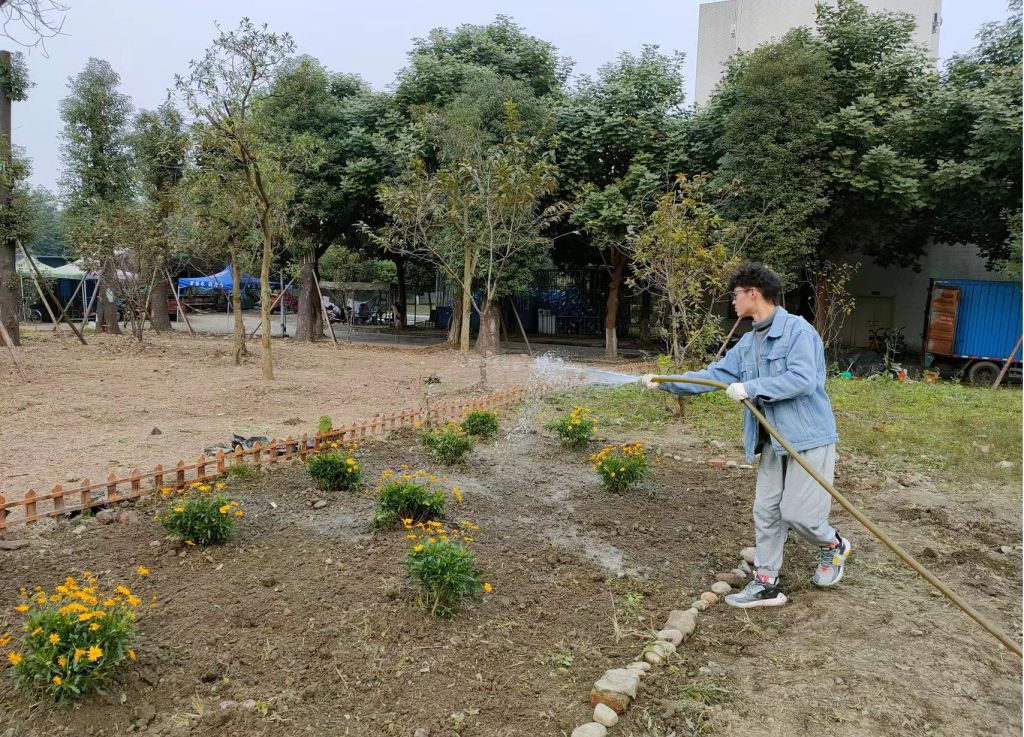 经过了前一日的除草耕地,原本荒芜的土地也变得可人了许多。由于13日下午同学们已提前将买好的满天星、杜鹃、木春菊植株搬到“开心农场”,14日下午3:30同学们到达农场后便迅速开始了植株种植。“慢工出细活”,同学们用铁锹细心刨出一个个小土坑,小心翼翼地将植株放进去,用土盖好,再用铁锹将土拍紧,最后用水管给植株浇水。下午5:00左右,一株株花儿就都种好了,原本荒芜的农场在大家的共同努力与精心装扮下变成了美丽的小花园,也成为四川大学江安校区一处靓丽的风景。