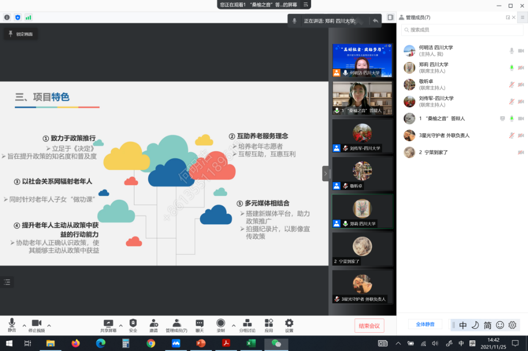 为深入贯彻落实党的十九大精神,激发大学生关注社会、热心公益的积极性,深化校地合作,在四川省民政厅支持下,中共四川省社会组织第二综合党委、四川省社会组织管理局于2021年10月发起“美好社会•益起参与”四川省大学生公益项目设计大赛,我院社会学与心理学系承办本次大赛的校内初赛工作。2021年11月25日“美好社会•益起参与”四川大学校内初赛以在线会议的方式圆满完成!