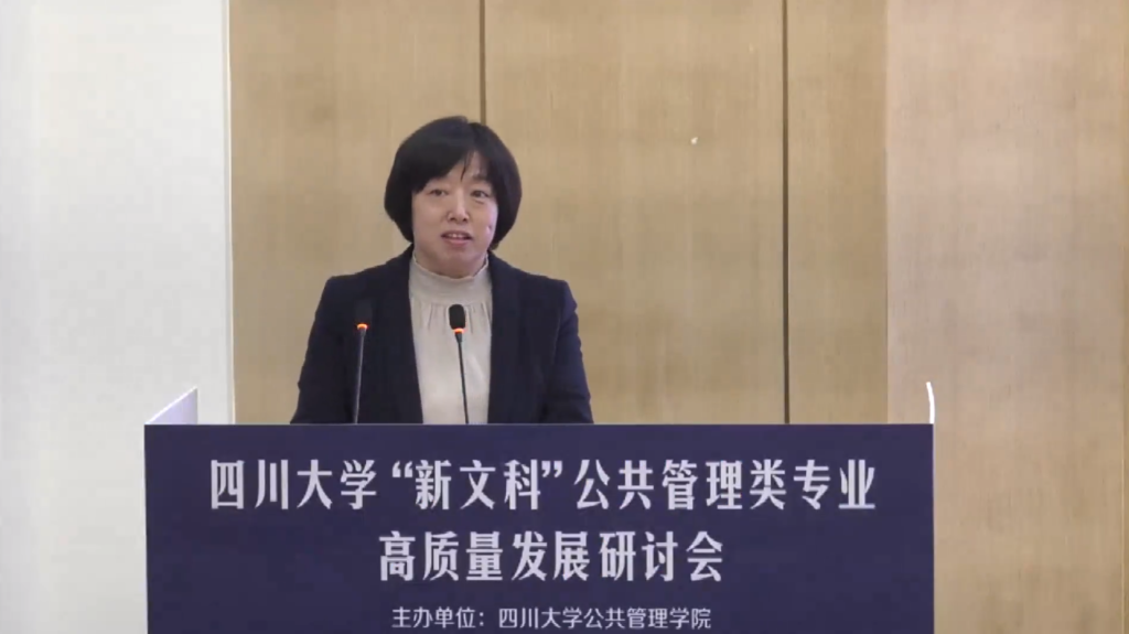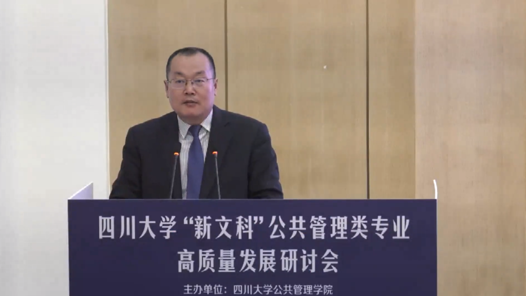 国家级教学成果特等奖、宝钢优秀教师特等奖获得者、四川大学教务处处长、教师教学发展中心主任张红伟教授对与会的领导和老师表示了欢迎。在致辞中主要汇报了四川大学本科专业建设的基本情况,指出自2018年以来,四川大学一直坚持以“四新”建设为引领的新文科、新理科、新工科、新医科的专业高质量发展。张红伟教授指出,建设高等教育强国,一流人才培养是关键,而一流专业是基础。四川大学一直将一流专业建设作为培养一流人才的核心抓手。川大秉持控制规模、促进交叉、提升品质、彰显特色的原则,坚持“文优、理进、工改、医强”的发展路径,持续推进本科专业建设内涵式发展。张红伟教授分别从优化升级构建川大特色的本科专业布局,对接国家的重大战略需求、打造川大特色的一流专业品牌,通过“以评促教”持续完善专业质量的保障体系三个方面凝练阐述了川大在优化专业结构、建设一流专业和一流基地、推动专业认证和国际专业认证评估等方面的举措和成效。在新文科建设中,川大一方面通过开展跨学科交叉融合,多维度的开创文科人才的培养新模式,充分发挥多学科优势,建立法医学等融合学科,致力于以卓越学术引领新文科研究;另一方面融合数字技术,推动新文科与信息技术融合,取得了可喜的进展。最后,张红伟教授期待与会专家学者能够为川大公共管理类的专业发展提出高屋建瓴的战略建议,助力将公共管理类专业做精做实。
