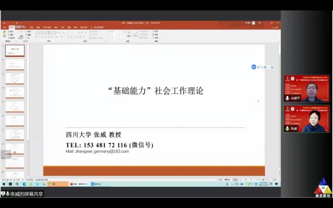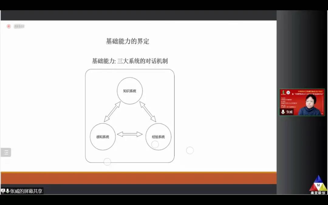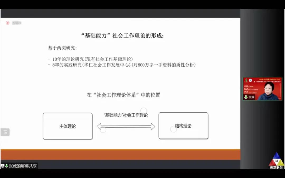 2021年12月25日,张威教授受中国社会工作教育协会邀请参加协会2021年会,并做大会发言。张威教授分享的主题是“基础能力”社会工作理论。该理论的提出,是张威教授过去10年社会工作基础理论研究以及8年社会工作实践研究的长期行动和思考的循环结果。