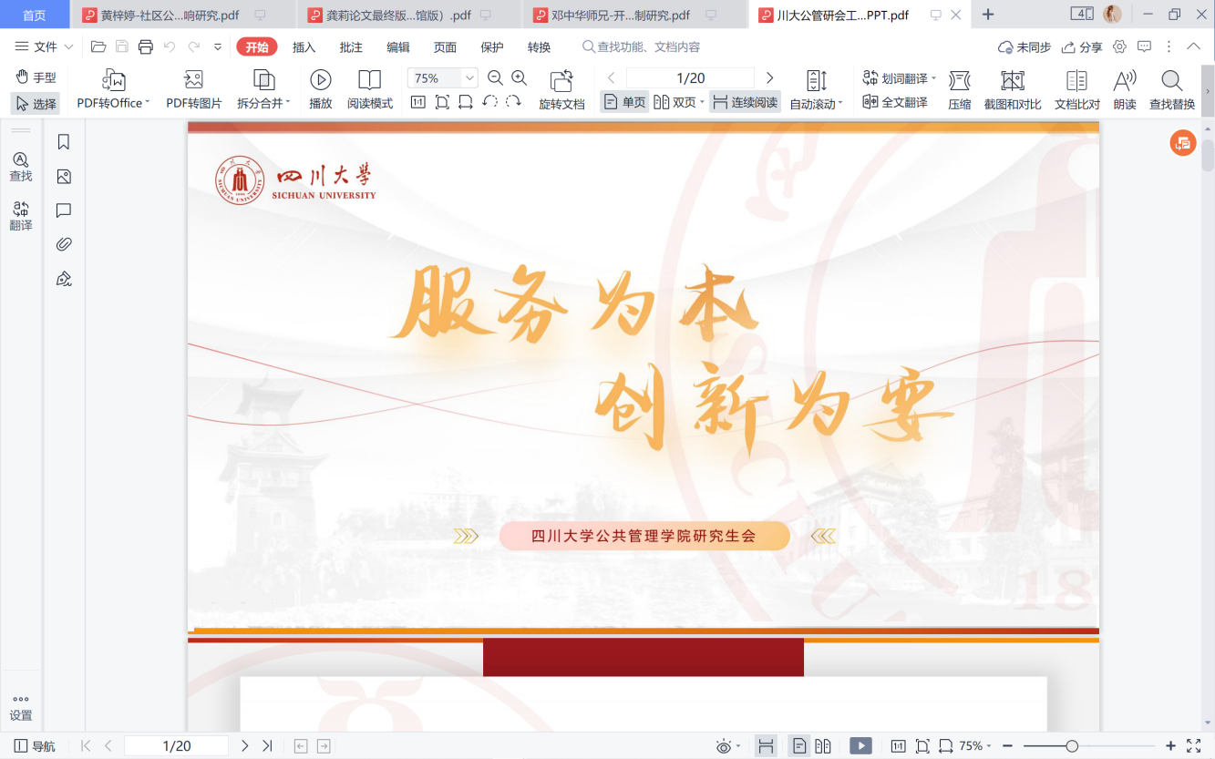 首先,各校公管学院研究生会交流了工作成效与经验。我院研究生会主席侯捷同学以“服务为本、创新为要”为主题,从我院研究生会的组织架构、部门建设、干部能力提升等方面介绍,并以“思想引领”、“钻研崇学”、“强化实践”、“文体兼荣”四个维度开展工作回顾与经验总结。目前,我院研究生会已连续9年获评“四川大学十佳研分会”,并于2020年获评“成都市优秀研究生分会”。yl23411永利(集团)有限公司官网团委于今年荣获 “四川省五四红旗团委”称号。各校公管学院研究生会在分享中学习,在交流中进步,真正实现了共话发展、共创佳绩。
