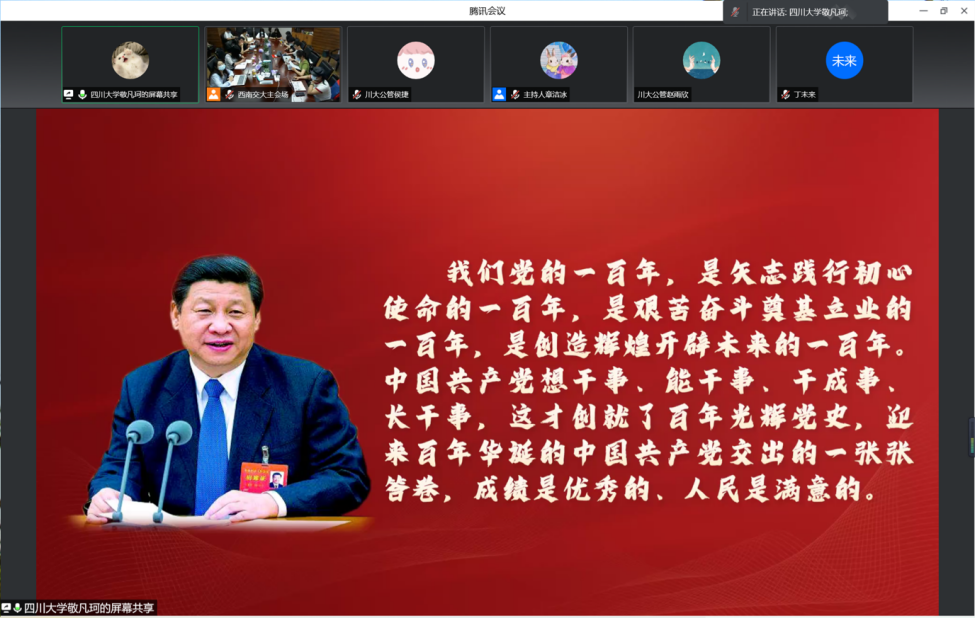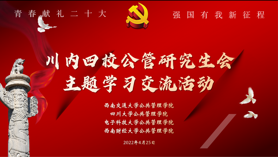 2022年4月25日晚,四川大学、电子科技大学、西南交通大学及西南财经大学四所高校yl23411永利(集团)有限公司官网主办的“青春献礼二十大,强国有我新征程”线上主题交流学习会顺利举行。我院研究生会主席侯捷同学、副主席敬凡珂同学在会上进行了交流发言,四所高校yl23411永利(集团)有限公司官网的相关指导老师、研究生代表参与了本次活动。