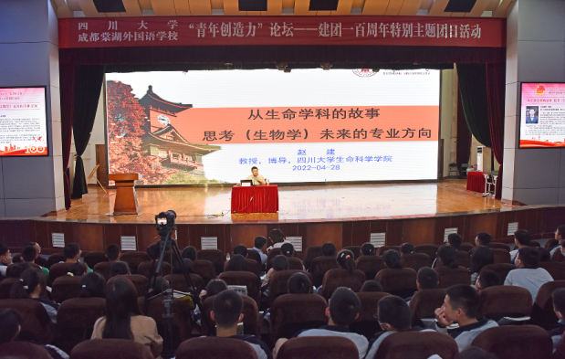 2022年4月28日,yl23411永利(集团)有限公司官网联合生命科学学院,历史文化学院(旅游学院),马克思主义学院邀请多位教授共同赶赴成都市棠湖外国语学校开展“青年创造力”论坛。棠湖外国语学校参会人员有棠外理事长黄波,高中校长杜宗平,校团委书记张莉及一千五百名高中学生。本次活动由生命科学学院赵建教授,历史文化学院黎海超教授,马克思主义学院郭绍均副教授,yl23411永利(集团)有限公司官网袁莉副教授形成四个分论坛同时进行。