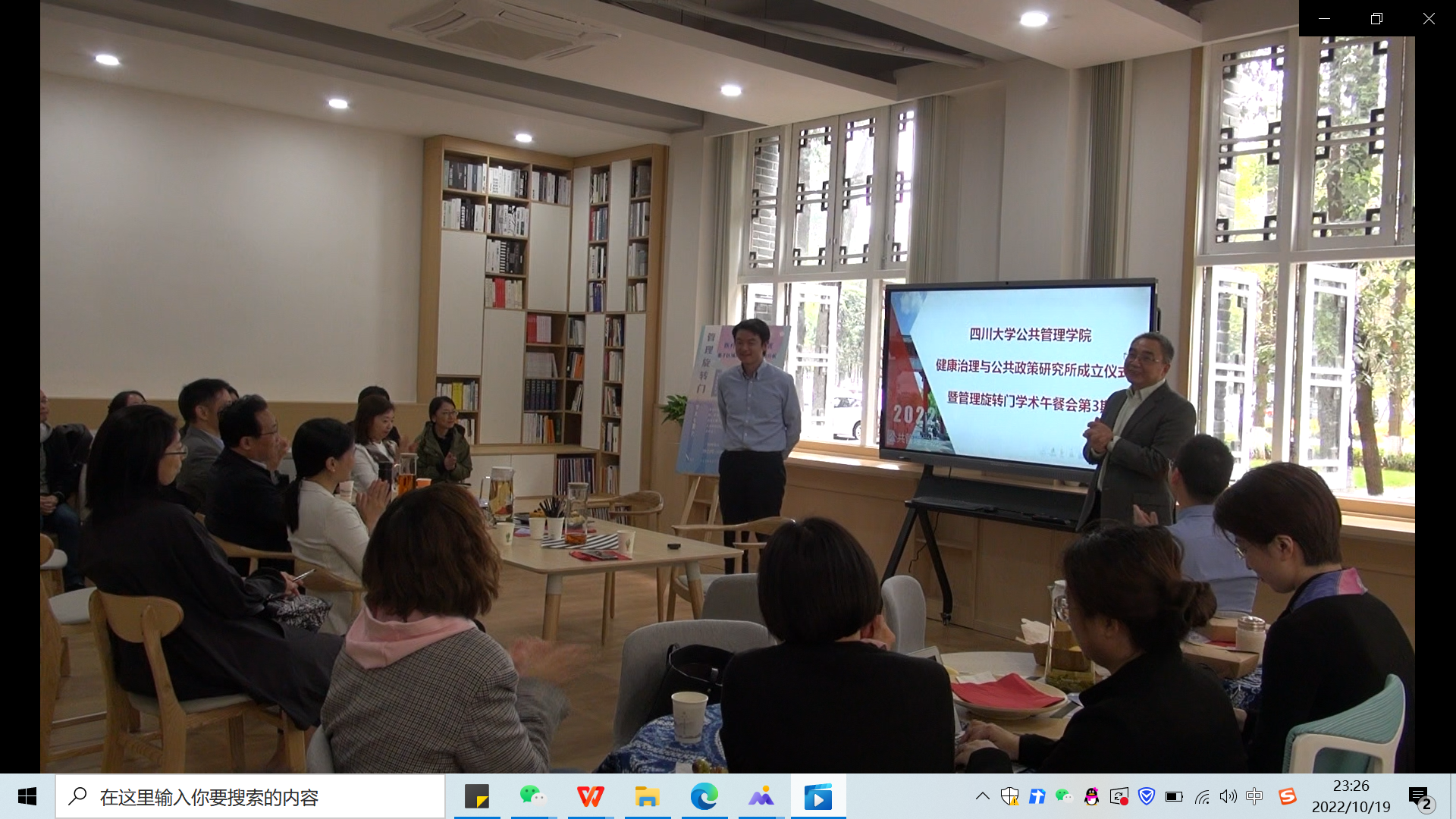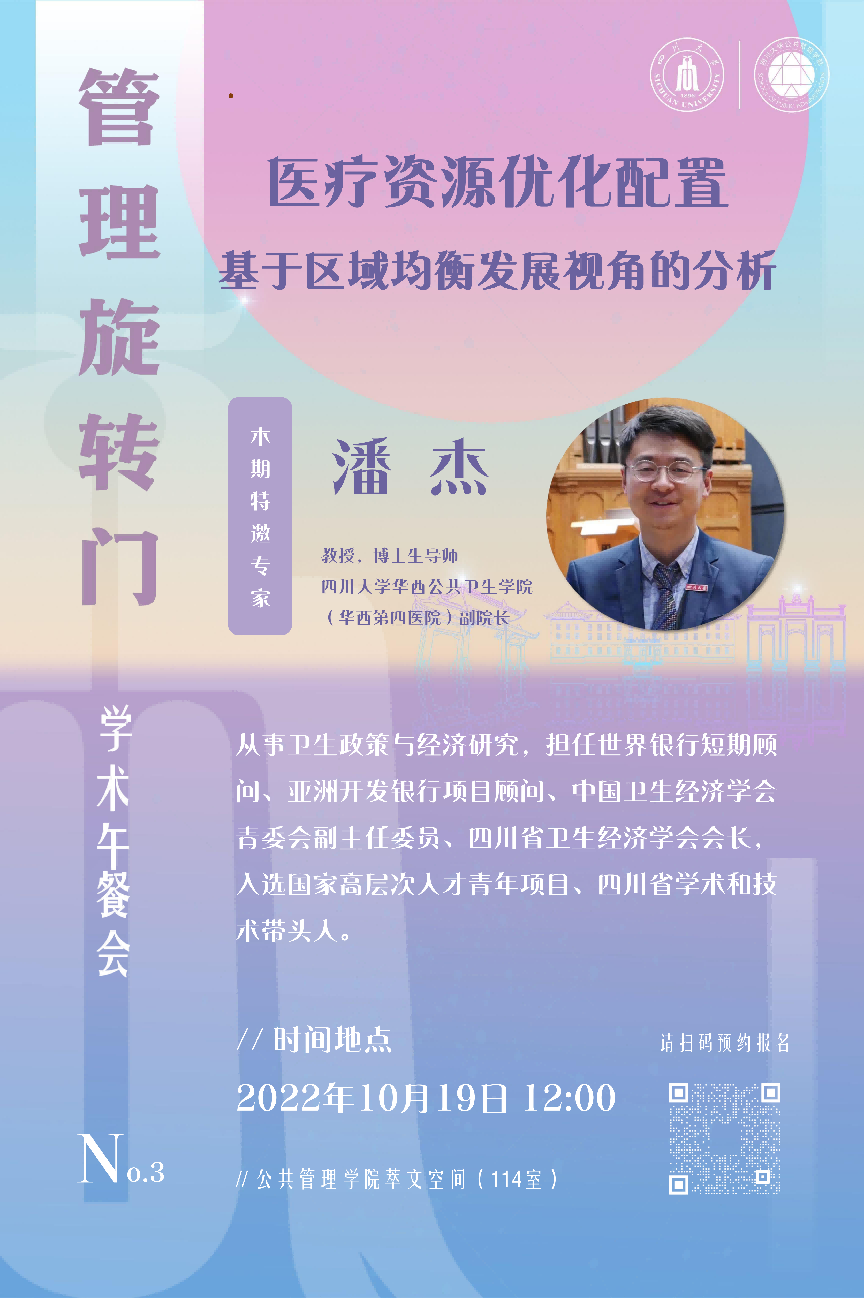 2022年10月19日,四川大学yl23411永利(集团)有限公司官网健康治理与公共政策研究所成立仪式和第3期“管理旋转门”学术沙龙在学院共享空间(萃文空间)举行。本次活动特邀华西公共卫生学院(华西第四医院)副院长、博士生导师潘杰教授作为主讲嘉宾,学院各系老师积极参加了此次学术活动。