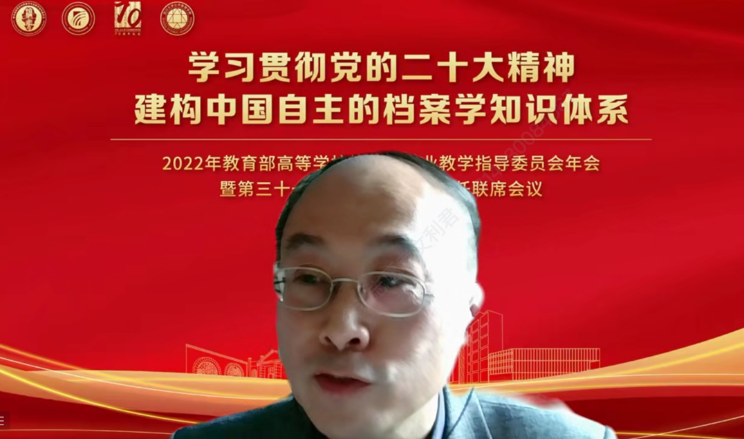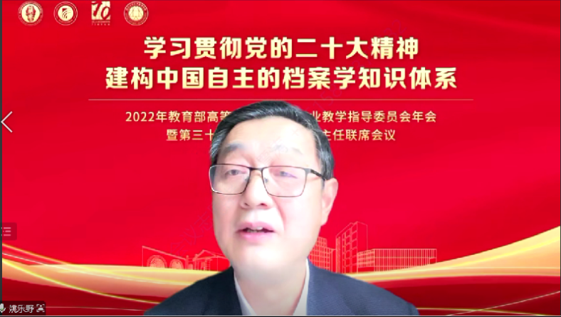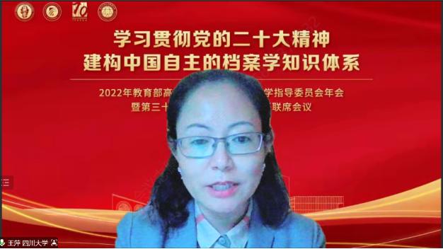 2022年11月12日,由教育部高等学校档案学专业教学指导委员会主办、四川大学yl23411永利(集团)有限公司官网与中国人民大学信息资源管理学院联合承办的2022年档案学教指委年会暨第31届档案学专业系主任联席会议如期在云端举行。本次会议是在党的二十大胜利召开后的档案学界的一次高层次会议。会议主题为“学习贯彻党的二十大精神,建构中国自主的档案学知识体系”。与会人员包括教育部高等教育司人文社科教育处张庆国处长、国家档案局人事司干部二处王琳处长、四川大学姚乐野副校长、档案学教指委主任委员、副主任委员、秘书长、委员及各高校档案学专业负责人。