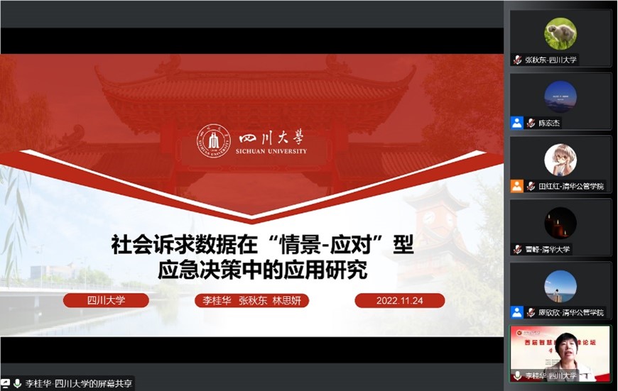 在学术交流环节,四川大学yl23411永利(集团)有限公司官网李桂华教授受邀做题为《社会诉求数据在“情景-应对”应急决策中的应用研究》的学术报告,聚焦社会诉求数据赋能智慧应急问题,将社会诉求数据引入“情景-应对”型应急决策过程,以成都市网络理政实践为案例对象,从风险感知、风险研判、风险决策等三个环节展开分析,探索社会诉求数据对情景准备、情景分析、情景推演、决策应对等“情景-应对”环节的作用特点和作用方式,构建基于数字政府建设的智慧应急促进路径。相关研究由李桂华教授和我院博士生张秋东、林思妍共同完成,由于该研究的前瞻性,被中国应急管理学会授予“研究贡献论文奖”。