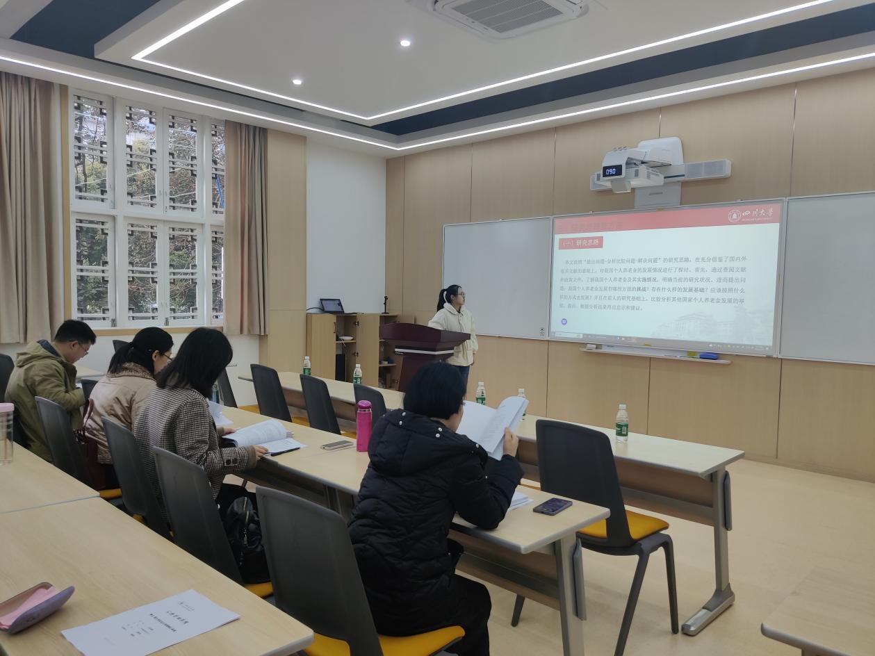 答辩分为学生汇报和老师提问点评两个环节。各组同学依次进行汇报,分别围绕论文研究背景、思路结构、方法与内容、结论与对策等开展陈述,并提出遇到的研究难点。选题方向聚焦于老年人心理健康、老年人社会参与、老年照料、职业使命感、个人养老金制度、城乡居民基本医疗保险、基本医疗保险待遇保障、社会救助、智慧养老服务平台等专业领域的热门话题。老师们在每位同学汇报完成后,对其论文进行了详尽的点评,指出了论文结构不够清晰、指标选取不够严谨、实证分析不够详尽、对策建议不够丰富、格式不够规范等问题。并对同学们目前的写作困惑予以耐心解答,同学们获益良多。最后,各答辩小组组长对预答辩进行了总结,要求同学们务必针对老师们指出的问题和给予的建议,认真修改和完善论文。