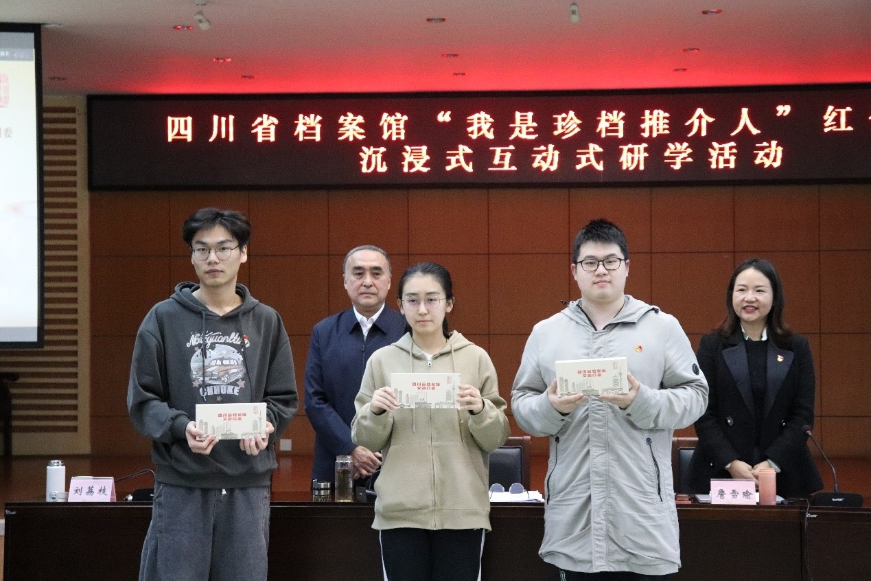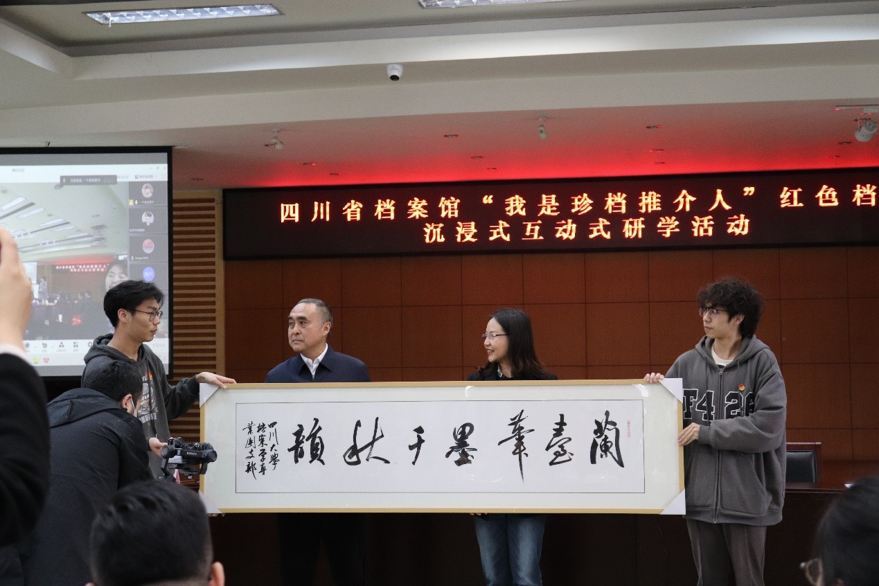 交流会的最后,档案班团支部以全体同学的名义赠送档案馆一幅书法作品——“兰台笔墨千秋韵”,“兰台”是档案管理机构的旧称,以表达对档案工作者的敬意和对四川省档案馆对本次活动支持的谢意。四川省档案馆也给yl23411永利(集团)有限公司官网教工和互动问答环节回答正确的同学赠送了相应的文创产品。