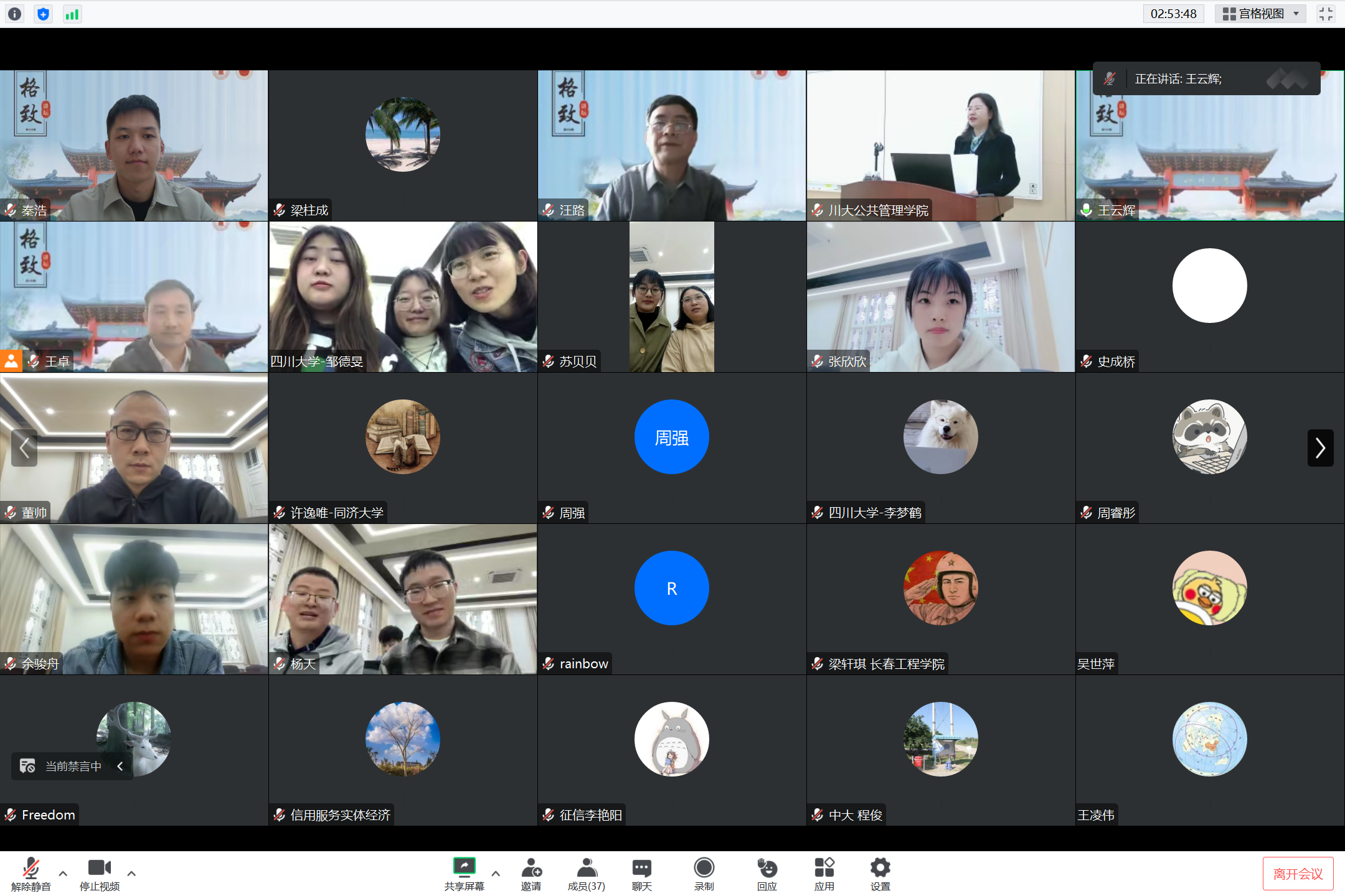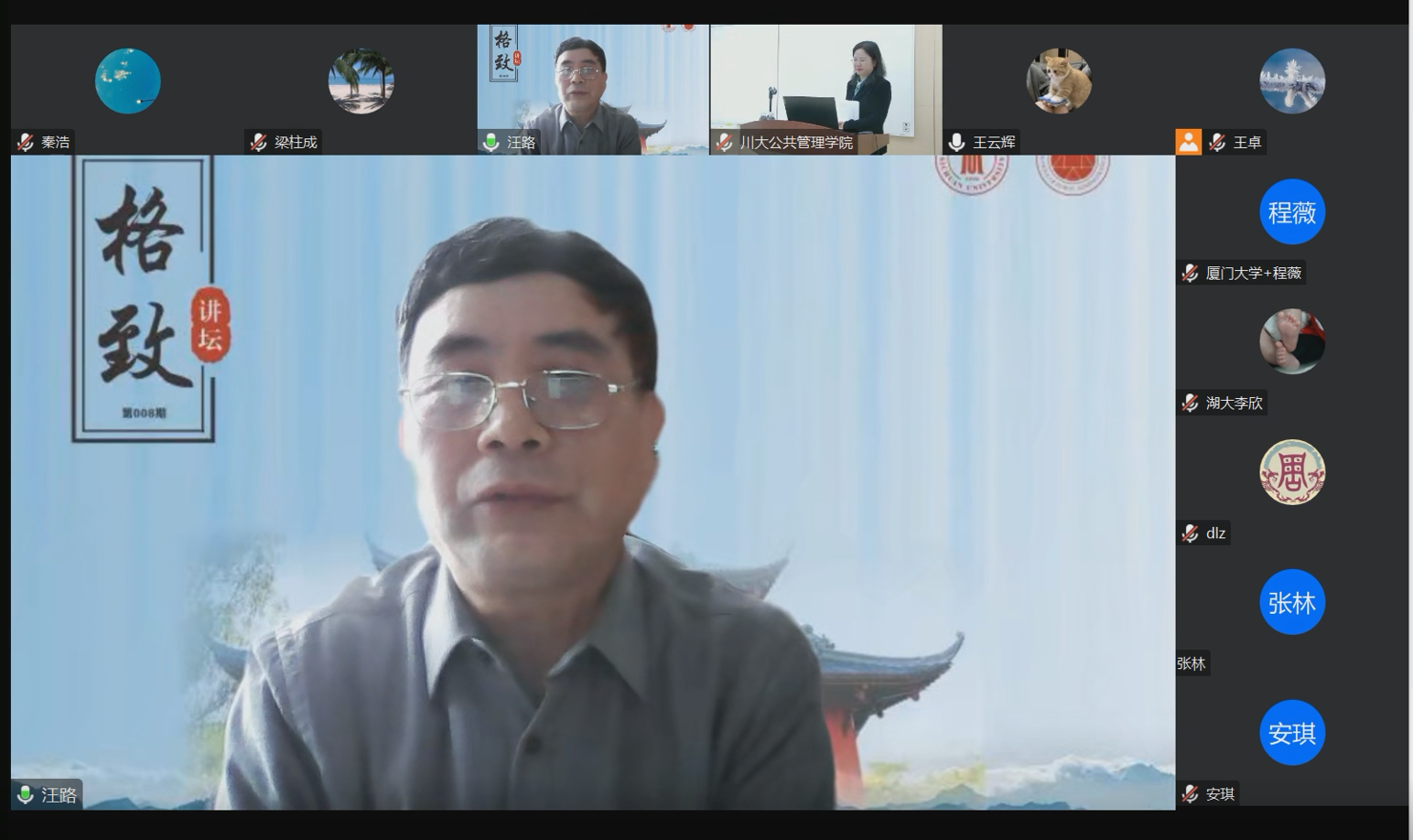 3月21日下午,中国人民银行征信中心原副主任、上海立信金融会计学院客座教授汪路应邀做客四川大学yl23411永利(集团)有限公司官网格致论坛,做题为“我国信用体系建设研究”的讲座。本次讲座采用线上线下结合的形式,一百余位来自本校和全国各地的师生、学者参加了本次讲座。