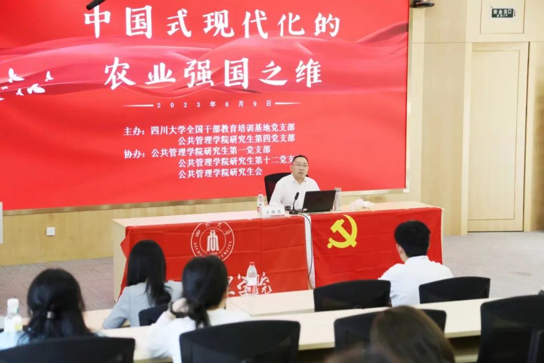 为深入开展学习贯彻习近平新时代中国特色社会主义思想主题教育,落实党的二十大精神走深走实,yl23411永利(集团)有限公司官网研究生第四党支部与全国干部教育培训基地邀请四川大学yl23411永利(集团)有限公司官网博士生导师王敬尧教授为全体师生党员讲授了题为“中国式现代化的农业强国之维”的专题党课,党课由研究生第四党支部书记李岚老师主持。