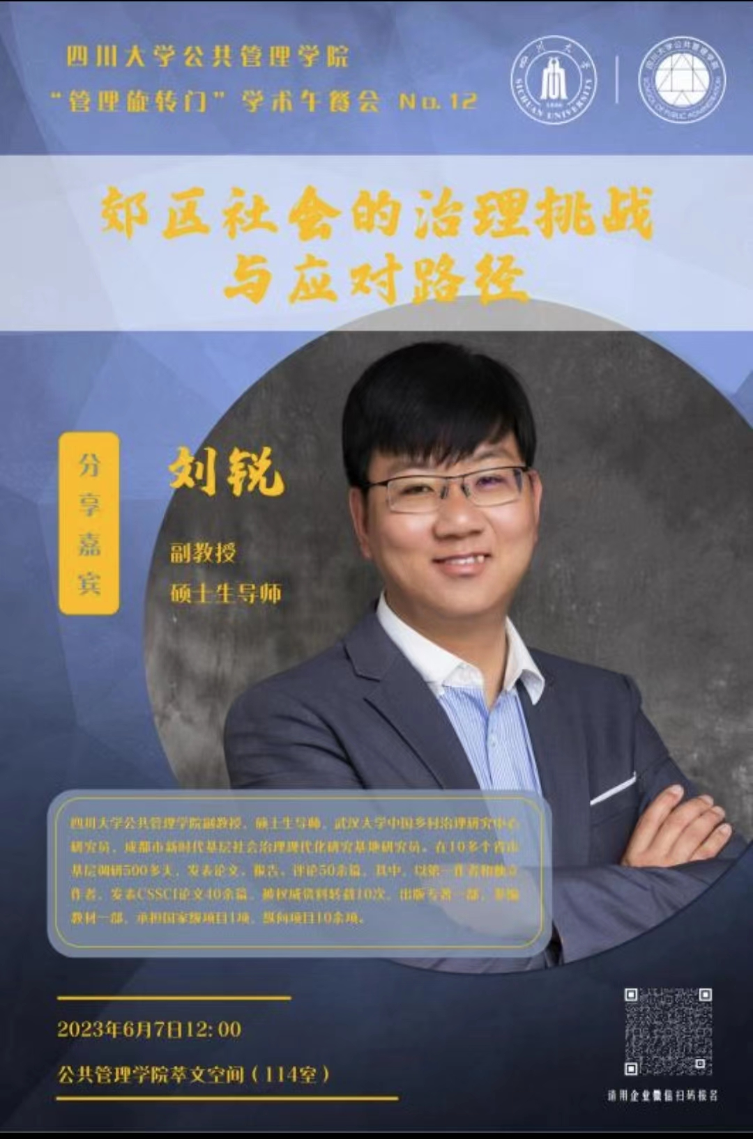 6月7日,四川大学yl23411永利(集团)有限公司官网在学院萃文空间成功开展第12期“管理旋转门”学术沙龙活动。本期学术沙龙特邀我院副教授刘锐老师作为主讲嘉宾分享“郊区社会的治理挑战与应对路径”主题。学院领导班子成员、各学科老师、研究生积极参加了此次交流。