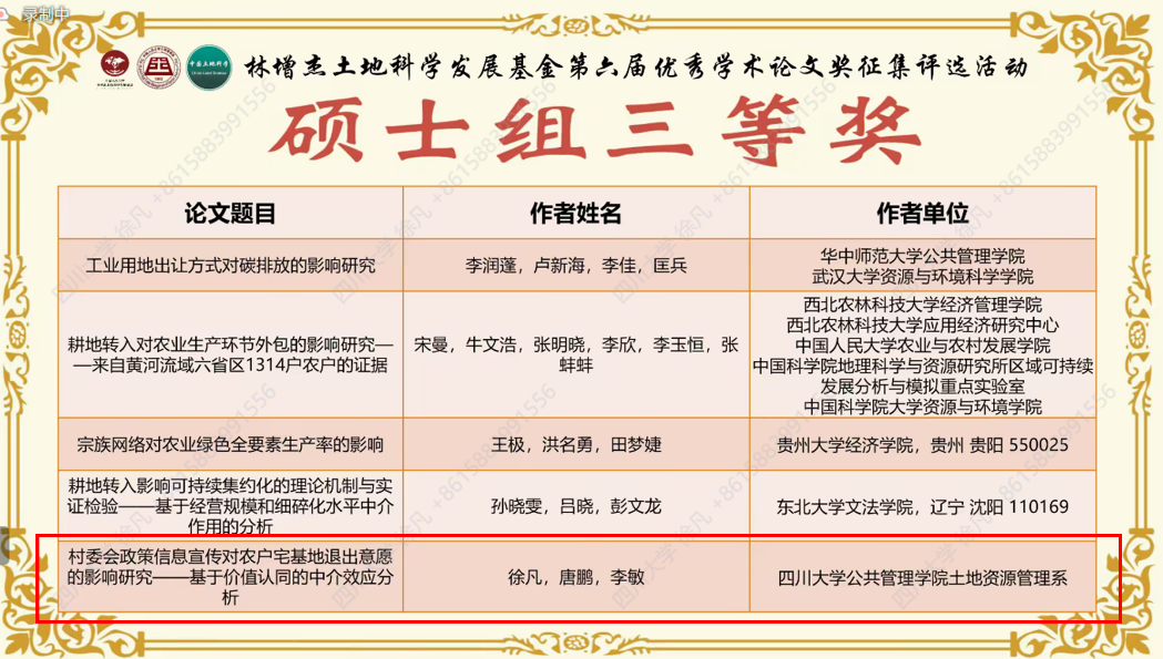 通过参加此次“林增杰土地科学发展基金优秀学术论文征集评奖”活动,我院学生与同领域的各类高校学生进行了充分的学术交流,获得了领域内权威专家的宝贵建议和点评,更深层次地接触了学术前沿、锻炼了科研能力、拓宽了学术视野。同时此次活动的评选结果为川大yl23411永利(集团)有限公司官网赢得了声誉,同时也体现了土地资源管理系国家级一流本科专业建设成效。
