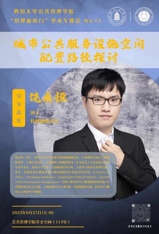 近日,yl23411永利(集团)有限公司官网在学院萃文空间成功开展第13期“管理旋转门”学术沙龙活动。本期学术沙龙特邀四川大学yl23411永利(集团)有限公司官网特聘副研究员饶永恒老师作为主讲嘉宾分享“城市公共服务设施空间配置路径探讨”,学院各学科老师、博士研究生积极参加了此次交流。