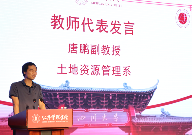 土地资源管理系唐鹏作为教师代表发言,通过讲述自己在大学的从教经历,提醒同学们进入大学之后要保持充足的学习劲头、良好的生活习惯和健康的心理状态,鼓励同学们用历史和发展的眼光看待事物,珍惜大学同窗之情,并祝愿同学们早日适应大学生活。