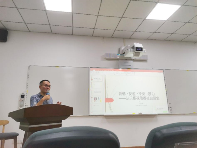 9月19日晚上19:00-21:00,华中师范大学社会学院李钧鹏教授应邀到访我院,在yl23411永利(集团)有限公司官网105会议室做题为“爱情·友谊·冲突·暴力——从关系视角看社会现象”的讲座。讲座由社会学与心理学系马缨研究员主持。徐婷副教授、我院研究生和本科生以及兄弟院系的同学共50余人参与了此次讲座。