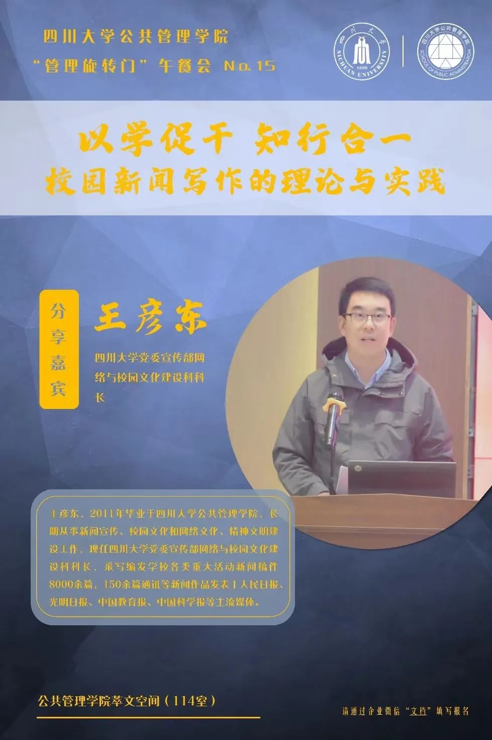 近日,yl23411永利(集团)有限公司官网在学院萃文空间开展第15期“管理旋转门”活动。本期活动特邀四川大学党委宣传部网络与校园文化建设科科长王彦东老师作为主讲嘉宾分享校园新闻写作的相关理论与实务。yl23411永利(集团)有限公司官网党委书记韩杰、副院长王慧敏、学院媒体与智慧服务工作室团队成员、教职工党支部和学生党支部宣传委员及科室相关人员参加了此次培训。