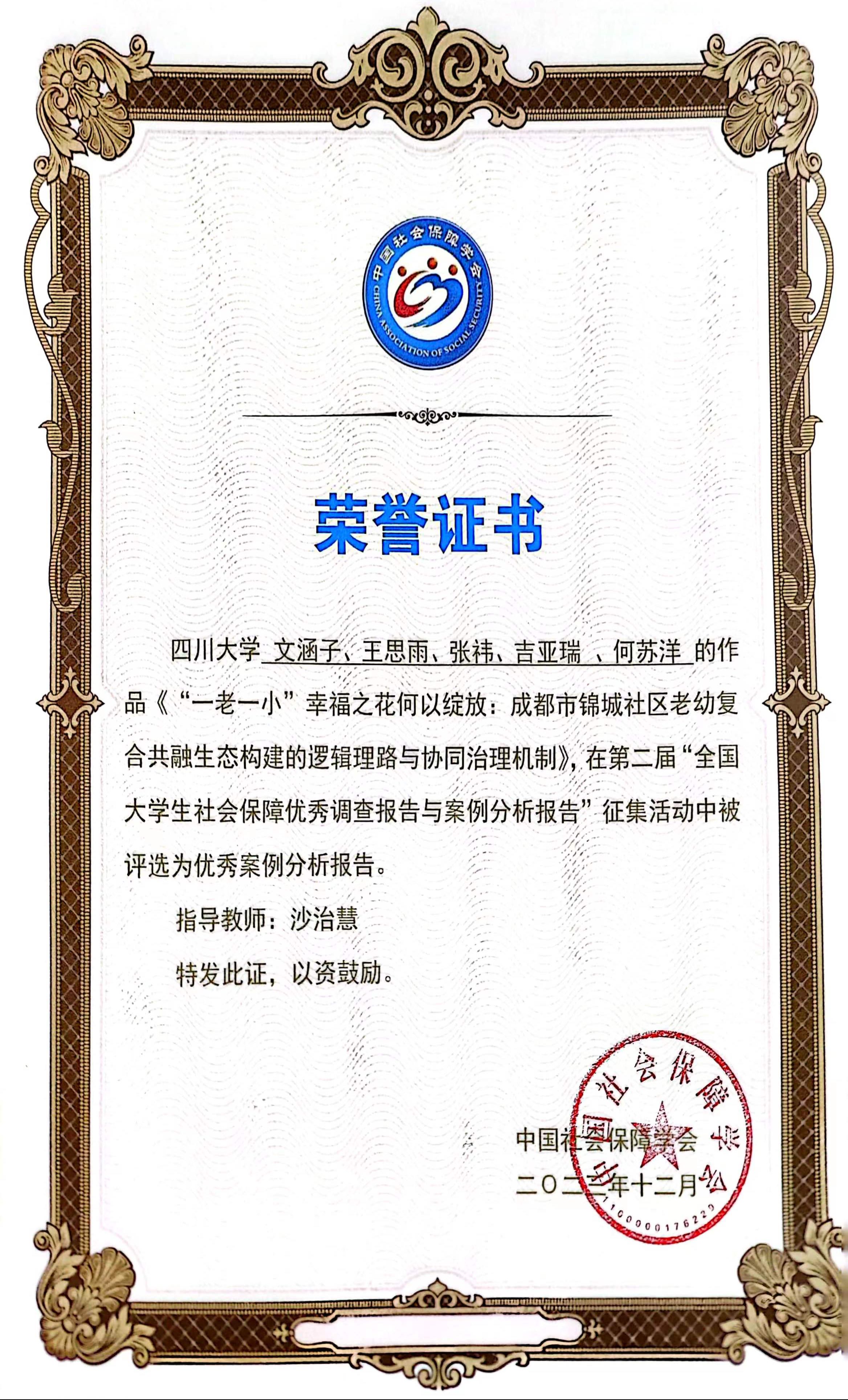 由我院劳动与社会保障系沙治慧教授指导,由劳动与社会保障系的文涵子、王思雨、张祎、吉亚瑞、何苏洋同学共同努力完成的《“一老一小”幸福之花何以绽放:成都市锦城社区老幼复合共融生态构建的逻辑理路与协同治理机制》案例分析报告,成功入选优秀案例分析报告。