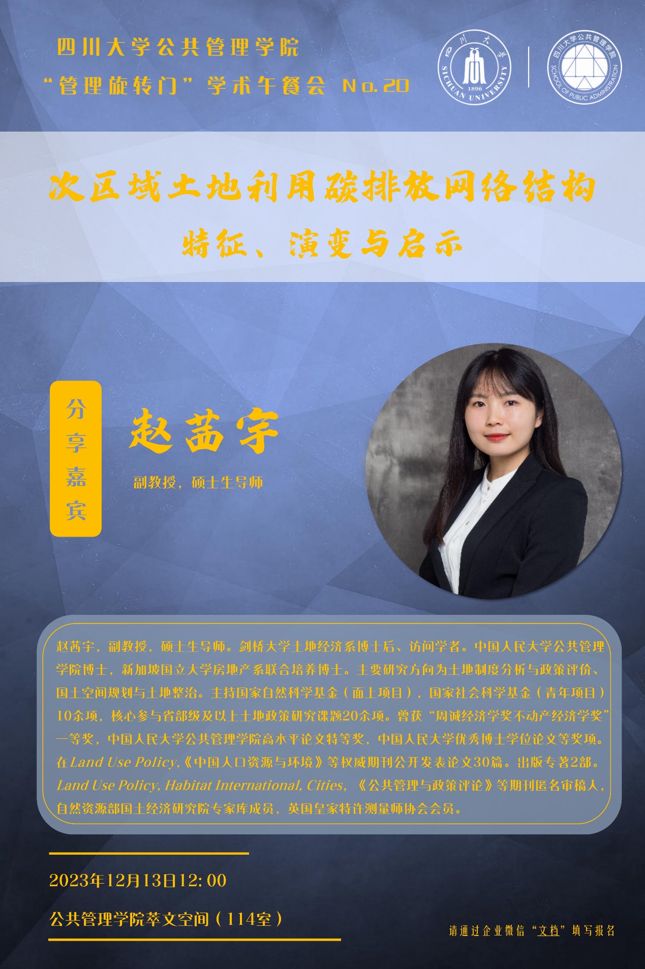 12月13日,yl23411永利(集团)有限公司官网在学院楼萃文空间成功开展第二十期“管理旋转门”学术沙龙活动。此次学术沙龙特邀剑桥大学土地经济系博士后、访问学者赵茜宇副教授分享“次区域土地利用碳排放网络结构:特征、演变与启示”,学院各学科老师、硕博研究生积极参加了此次跨学科交流。本期沙龙由劳动与社会保障系田益豪副研究员担任学术主持。