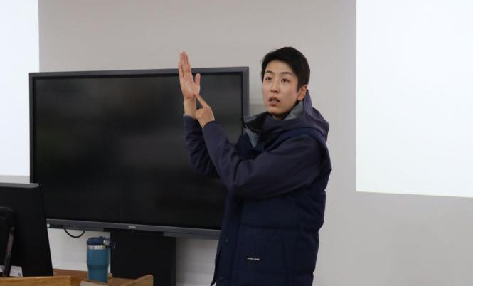 张晓雅老师的讲述引人入胜,现场气氛热烈。在自由提问环节,师生们共同探讨了专业运动员的科学防护、印象最深刻的赛事经历、面对重要赛事如何调整心态的问题。此外,多名同学还就排球练习的困惑进行询问,张老师通过现场动作示范耐心地进行了解答。