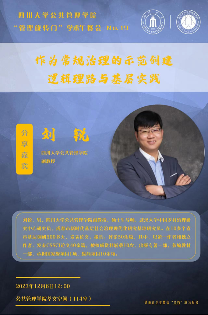 近日,yl23411永利(集团)有限公司官网在学院萃文空间成功开展第十九期“管理旋转门”学术沙龙活动。本期学术沙龙特邀本学院刘锐副教授分享“作为常规治理的示范创建:逻辑理路与基层实践”,学院各学科老师、博士研究生积极参加了此次交流。本期学术沙龙由劳动与社会保障系田益豪副研究员担任学术主持。