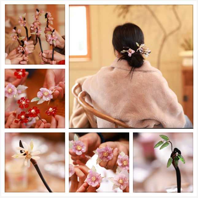 教职工们分组制作胸针和簪子,在美丽春色中打卡留念,共度美好节日时光,进一步增进了教职工的情感交流,满足了教职工多样化的文化需求,营造了更加轻松愉悦的团队氛围。