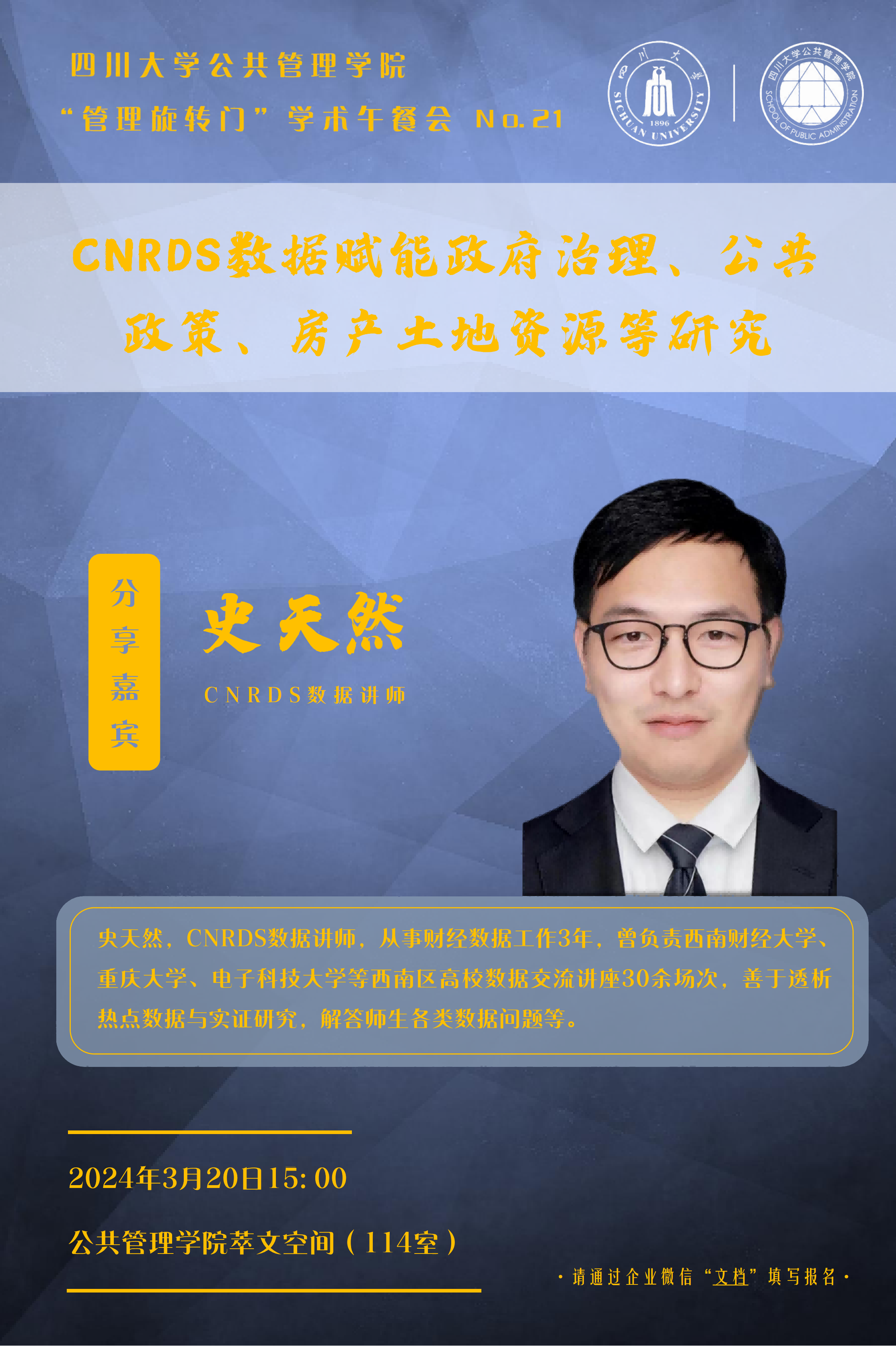 近日,yl23411永利(集团)有限公司官网在学院萃文空间成功举办第21期“管理旋转门”学术沙龙。本次活动特邀CNRDS(中国研究数据服务平台)数据讲师史天然老师进行了题为“CNRDS数据赋能政府治理、公共政策、房产土地资源等研究”的学术分享。本期学术沙龙由行政管理系刘磊教授担任学术主持。