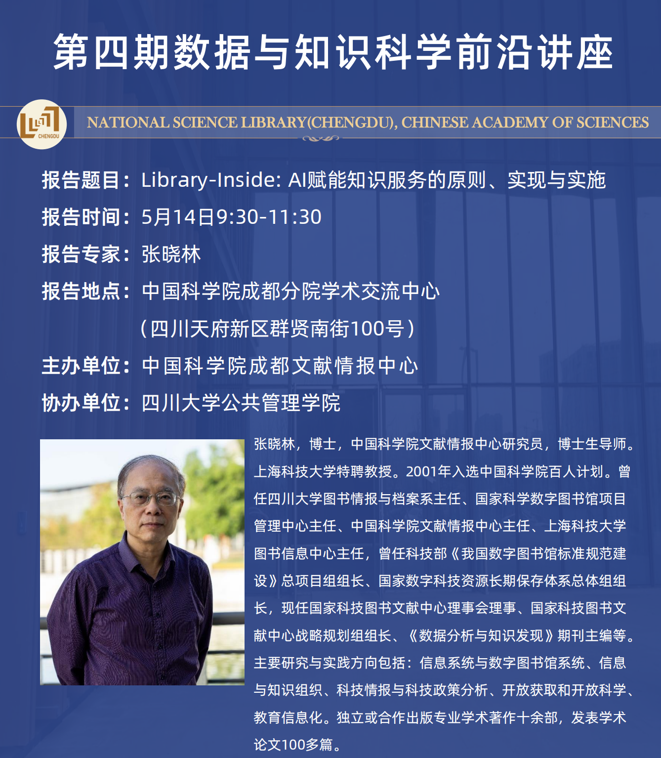 接着,同学们参加了由中国科学院成都文献情报中心主办,四川大学yl23411永利(集团)有限公司官网协办的第四期数据与知识科学前沿讲座。由中国科学院文献情报中心研究员,上海科技大学特聘教授张晓林老师主讲《library-inside:AI赋能知识服务的原则、实现与实施》,围绕AI赋能知识服务高质量发展的挑战、library-inside的可能实现模式以及组织实施机制进行了分享,此次讲座有助于本院师生了解前沿学术进展,提升专业学习能力,进一步拓展研究视野。