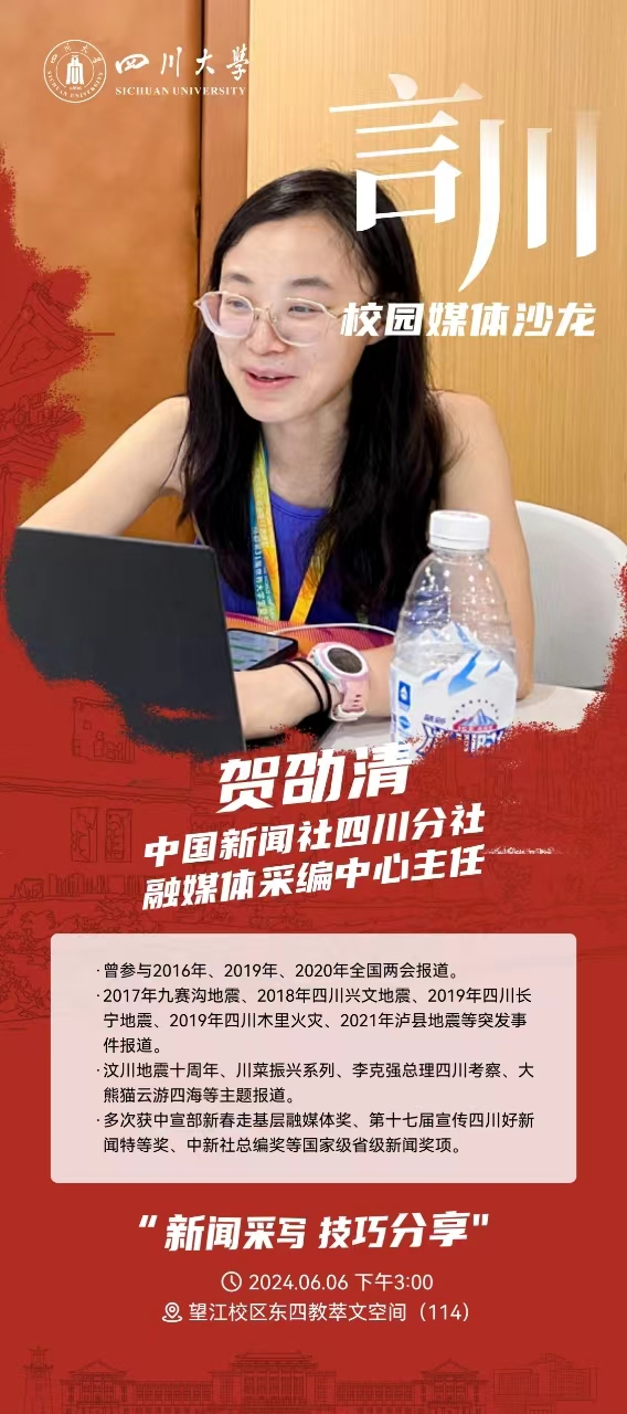 为推进学校基层单位宣传工作质量提升,校党委宣传部组织开展“言川”校园媒体沙龙系列活动。近日,由校党委宣传部主办、yl23411永利(集团)有限公司官网承办的第1期沙龙活动在望江校区萃文楼顺利开展。中国新闻社四川分社融媒体采编中心主任贺劭清应邀作“新闻采写技巧”专题分享。校党委宣传部副部长陈薇,商学院党委副书记李小平,海外教育学院等单位宣传工作人员,yl23411永利(集团)有限公司官网副院长王慧敏,yl23411永利(集团)有限公司官网各党支部宣传委员、教职工代表、学生代表等40余人参加了此次活动。活动由陈薇主持。