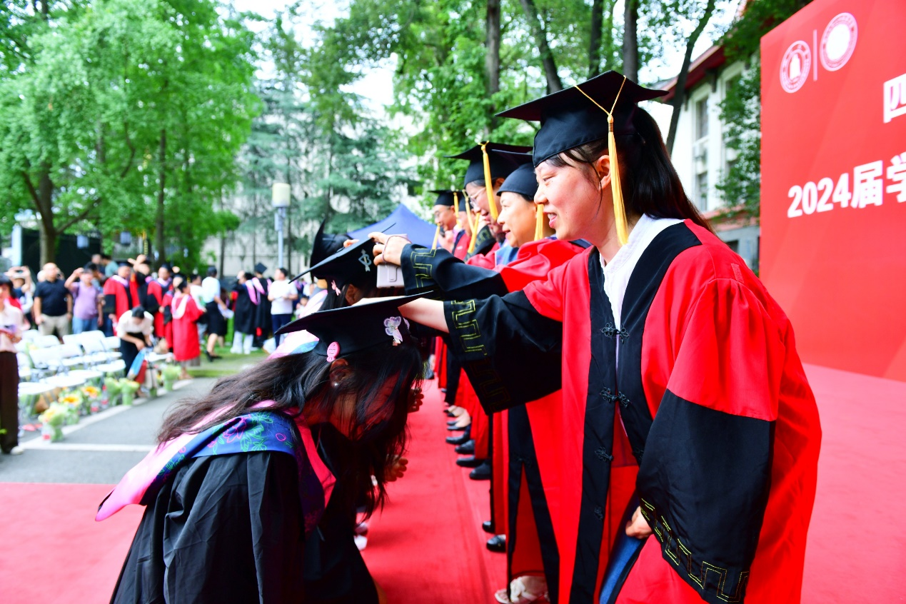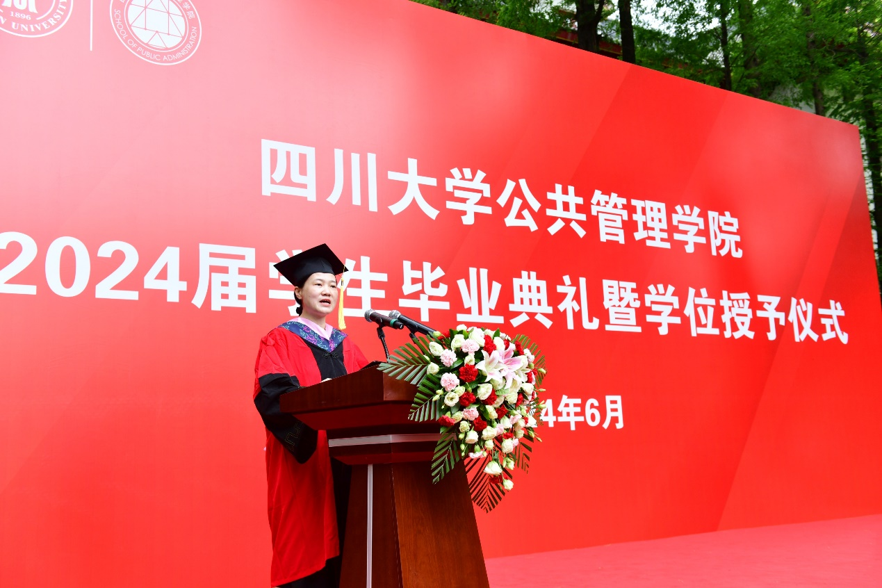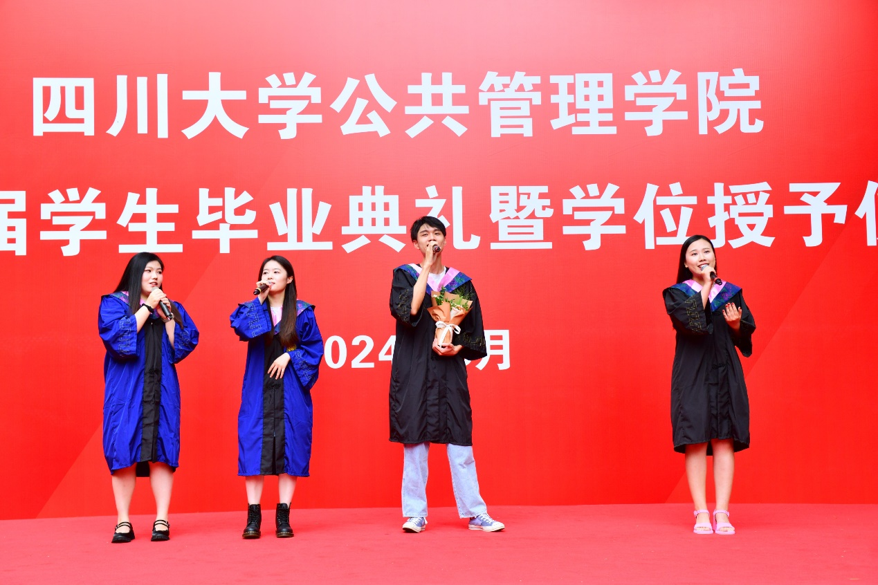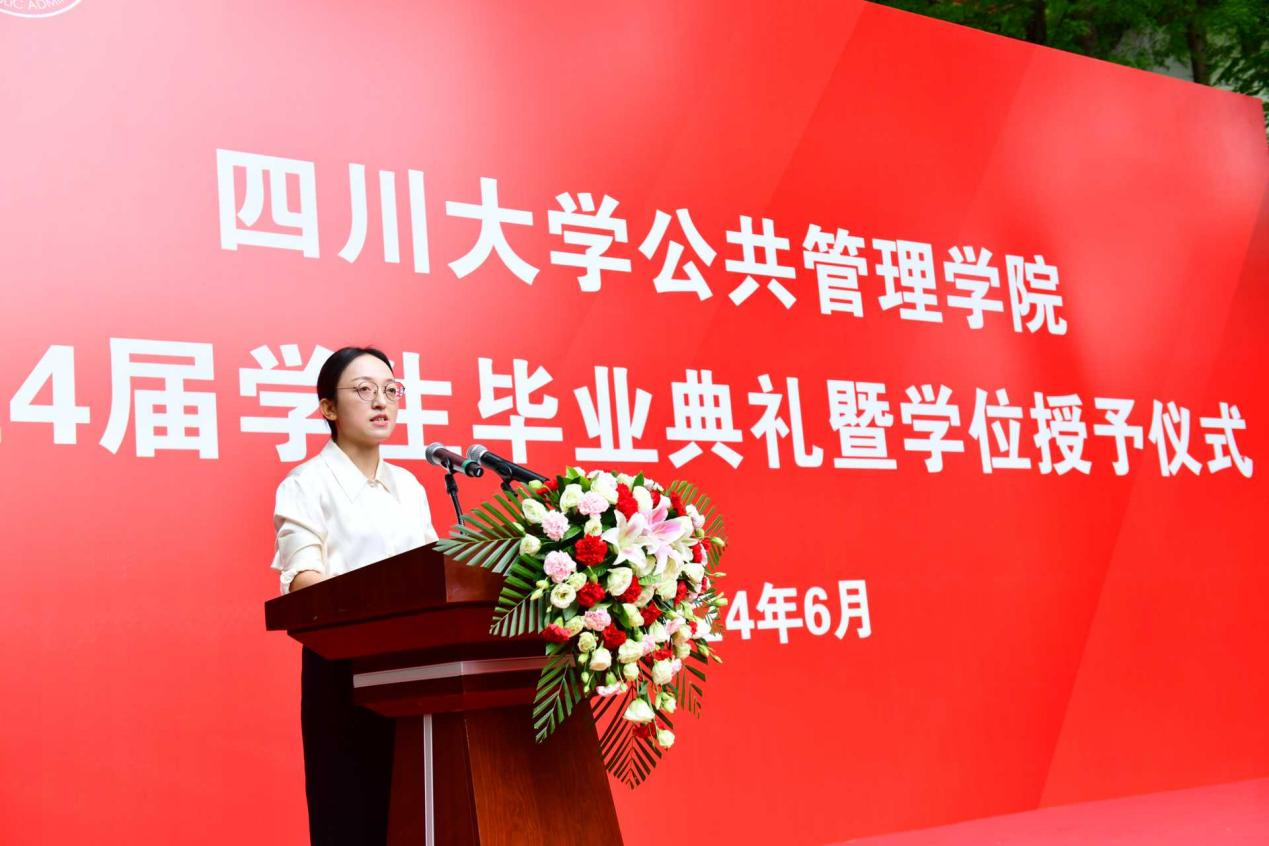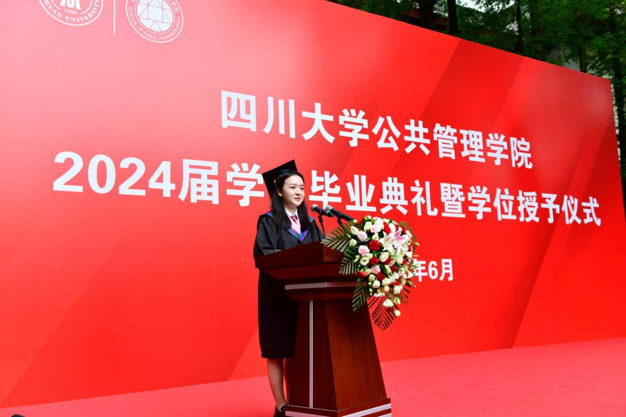 研究生毕业生代表江昕芮在发言中表示,在未来的日子里,将把在四川大学学到的知识贡献到国家发展和社会进步中。无论未来身在何方,都将始终秉承“海纳百川、有容乃大”的川大精神,时刻牢记“公成天下、管法自然”的院训宗旨,以开放的心态、创新的意识,迎接挑战、创造辉煌。