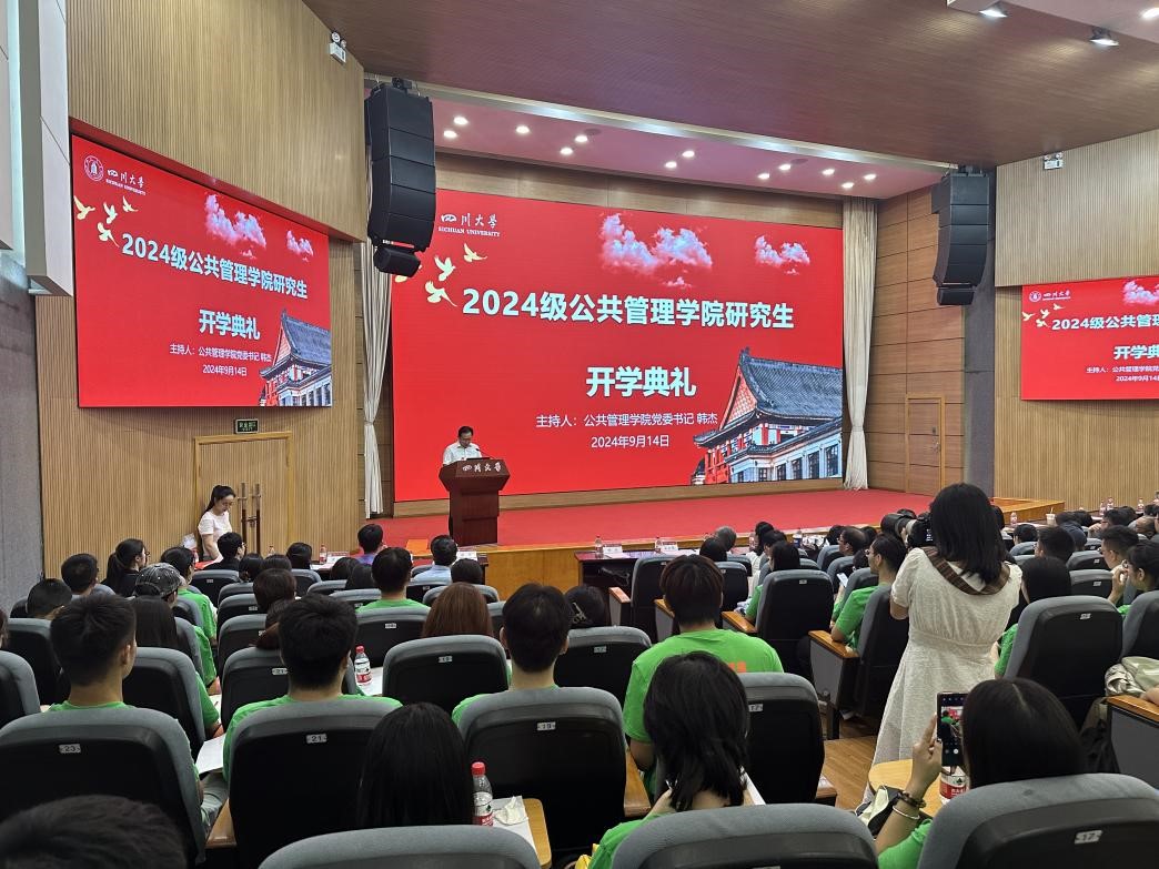 9月14日下午,四川大学yl23411永利(集团)有限公司官网2024级研究生开学典礼暨“开学第一课”在望江校区西区五教演播厅隆重举行。yl23411永利(集团)有限公司官网教授委员会主任姜晓萍、党委书记韩杰、院长夏志强、党委副书记罗亚玲、副院长王慧敏,师生代表及2024级全体新生参加典礼,开学典礼由党委书记韩杰主持。