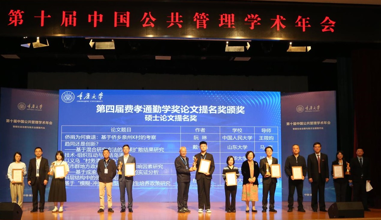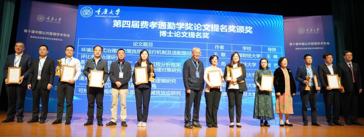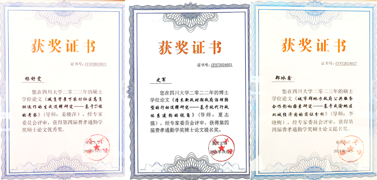 费孝通勤学奖简介:重庆大学“费孝通勤学奖”作为公共管理学科领域首次设立的学位论文奖,是公共管理学科学术共同体对学位论文综合性评议最严格的奖项,至今已经举办4届。2024年度参评论文范围是2021年7月至2023年6月在中国普通高等学校公共管理学科博士点、硕士点和MPA学位点获得学位的毕业生论文,设公共管理优秀博士学位论文、优秀硕士学位论文、优秀MPA学位论文三类奖各0-1名,提名奖各0-5名,宁缺毋滥。经过四轮匿名评审,我院三名学子撰写的学位论文从1493篇文章中脱颖而出。