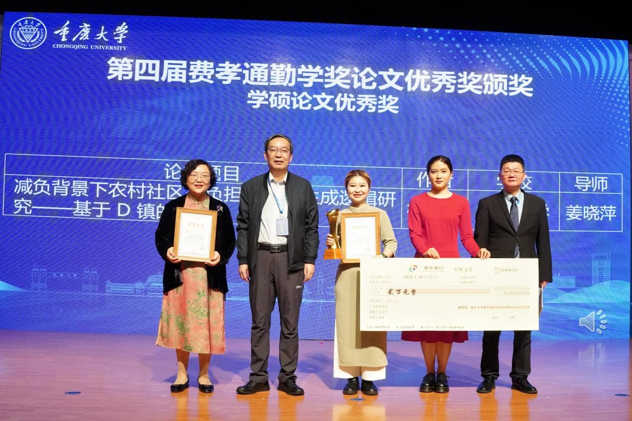 10月12日,第四届“费孝通勤学奖”颁奖典礼在重庆大学举行。继我院2020届硕士白浩然同学获得第三届“费孝通勤学奖”唯一优秀硕士学位论文奖(指导教师李晓梅)以来,杨舒雯、史军、郑冰鑫3位同学在本届评选中再创佳绩。