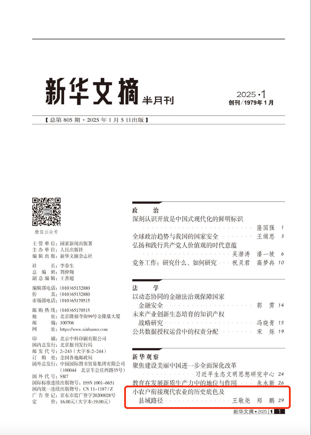 1月5日出版的《新华文摘》(2025年第1期)转载了我院王敬尧教授、郑鹏博士生的合著论文。