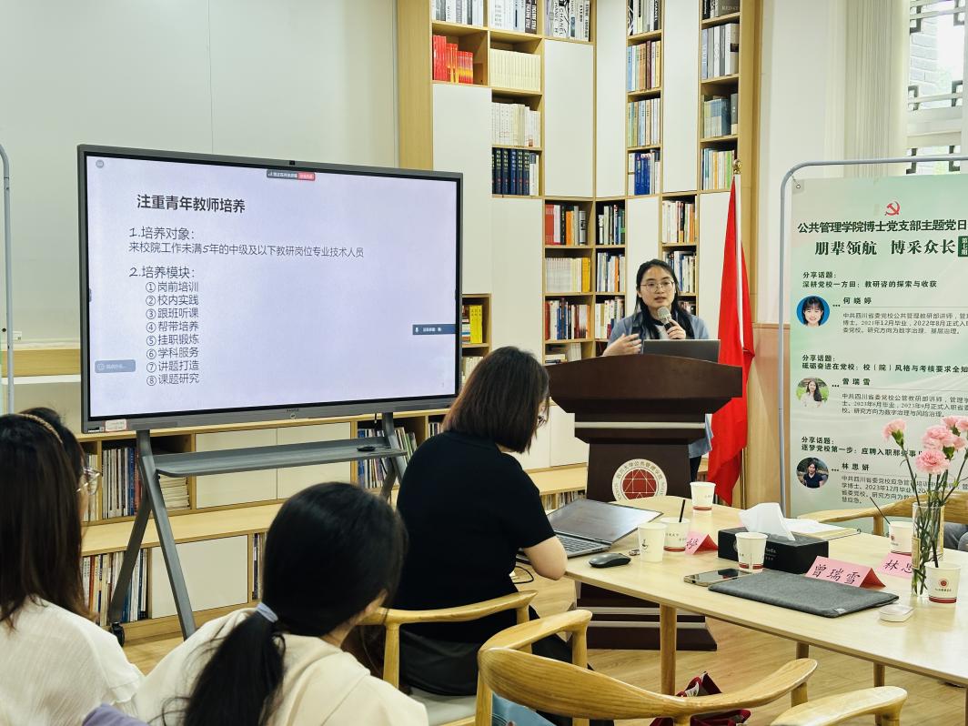 何晓婷老师以《深耕党校一方田:教研咨的探索与收获》为题,重点介绍了党校教师在教学、科研、咨政三方面的工作内容与特点,强调理论与实践融合的党校育人特色。