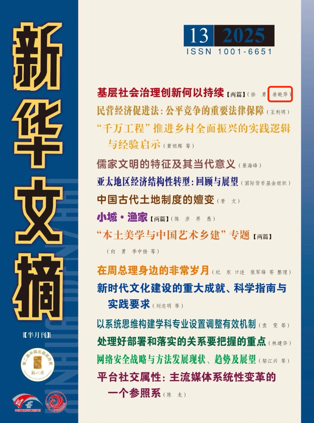 7月出版的《新华文摘》(2025年第13期)转载了我院姜晓萍教授的论文《基层社会治理的创新扩散》。
