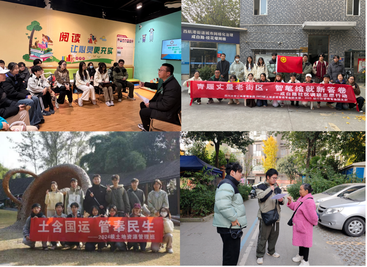2023级行政管理与土地资源管理专业团支部联合组建实践团队,深入周边社区开展专项行动。同学们不仅结合全会精神向居民进行通俗易懂的政策解读,更围绕社区养老、环境治理、停车规划等具体问题,运用专业所学开展问卷调查、组织议事协商、设计解决方案,将理论学习的成果转化为服务群众、参与基层治理的实际能力,赢得了社区工作人员和居民的好评。
